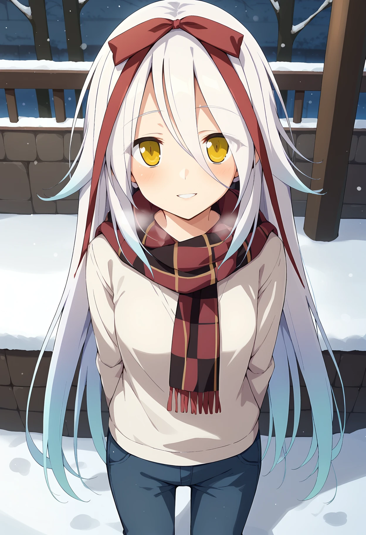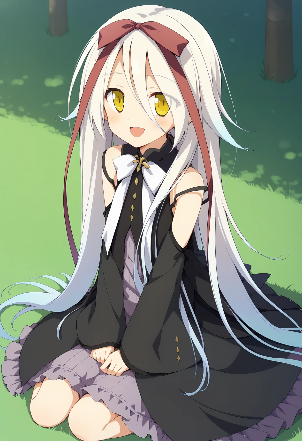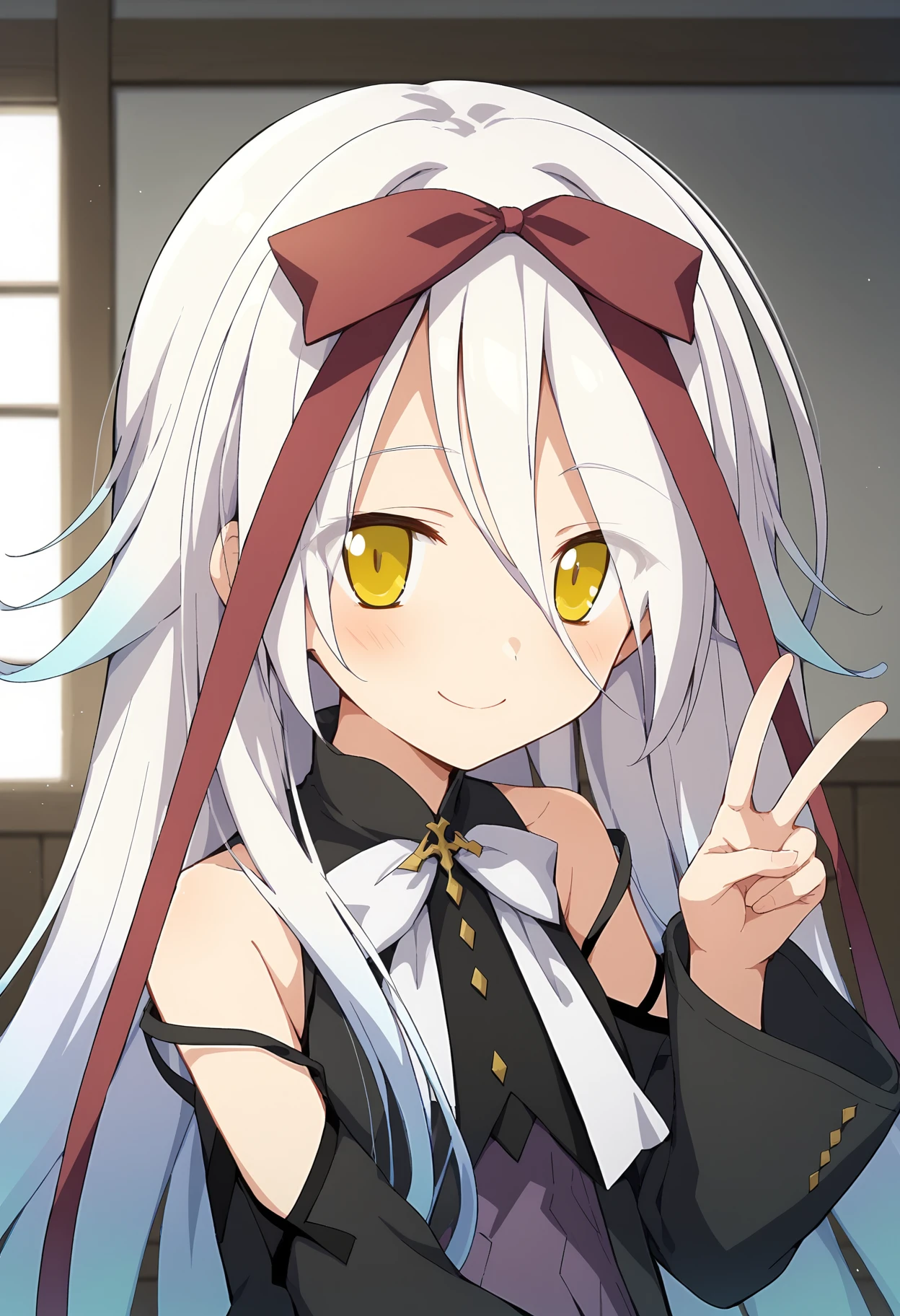 white hair, long hair, very long hair, gradient hair, multicolored hair, hair between eyes, yellow eyes, hair ribbon, red ribbon,outfit