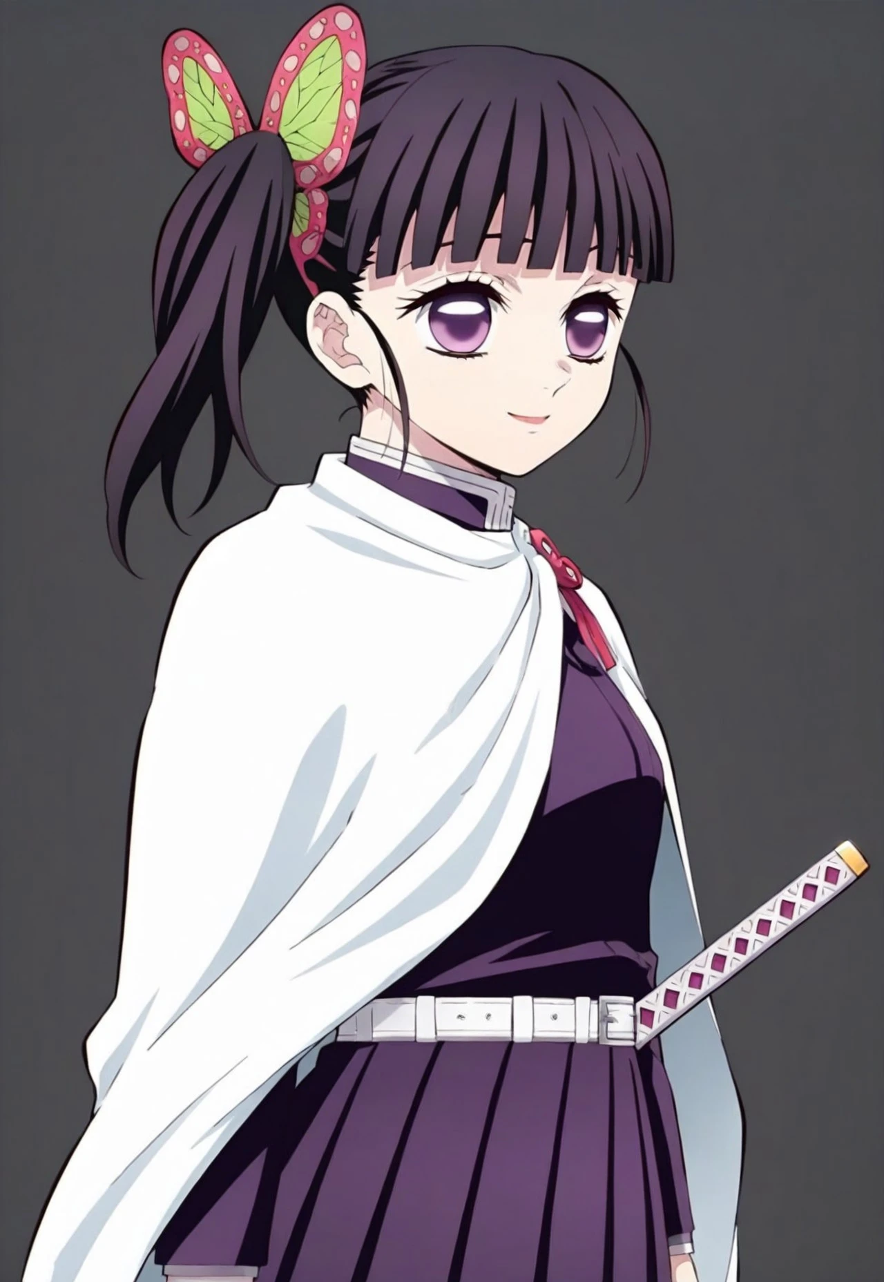 dark purple uniform, long sleeved buttoned top, white cape, red butterfly shaped brooch at collar, pleated skirt matching top color, butterfly hair clip accessory,
