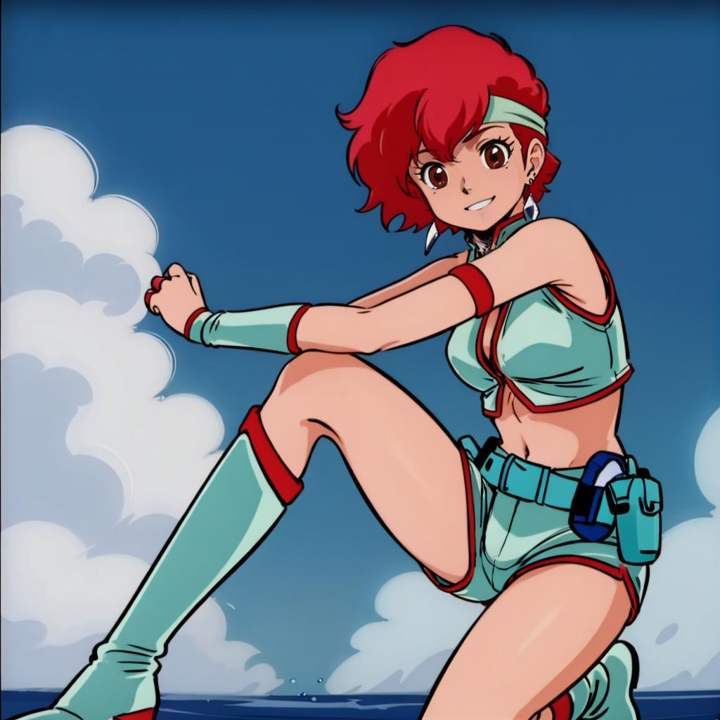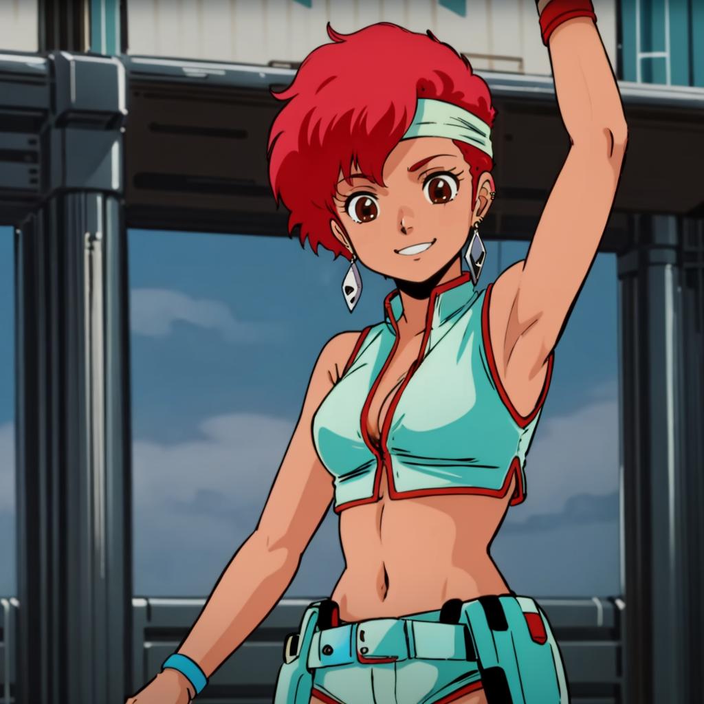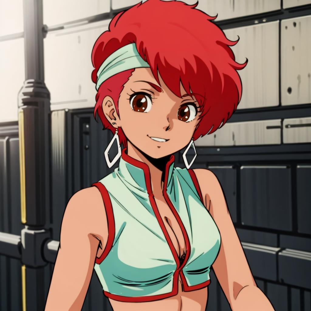 hairband,short hair,red hair,earrings,brown eyes,dark skin,