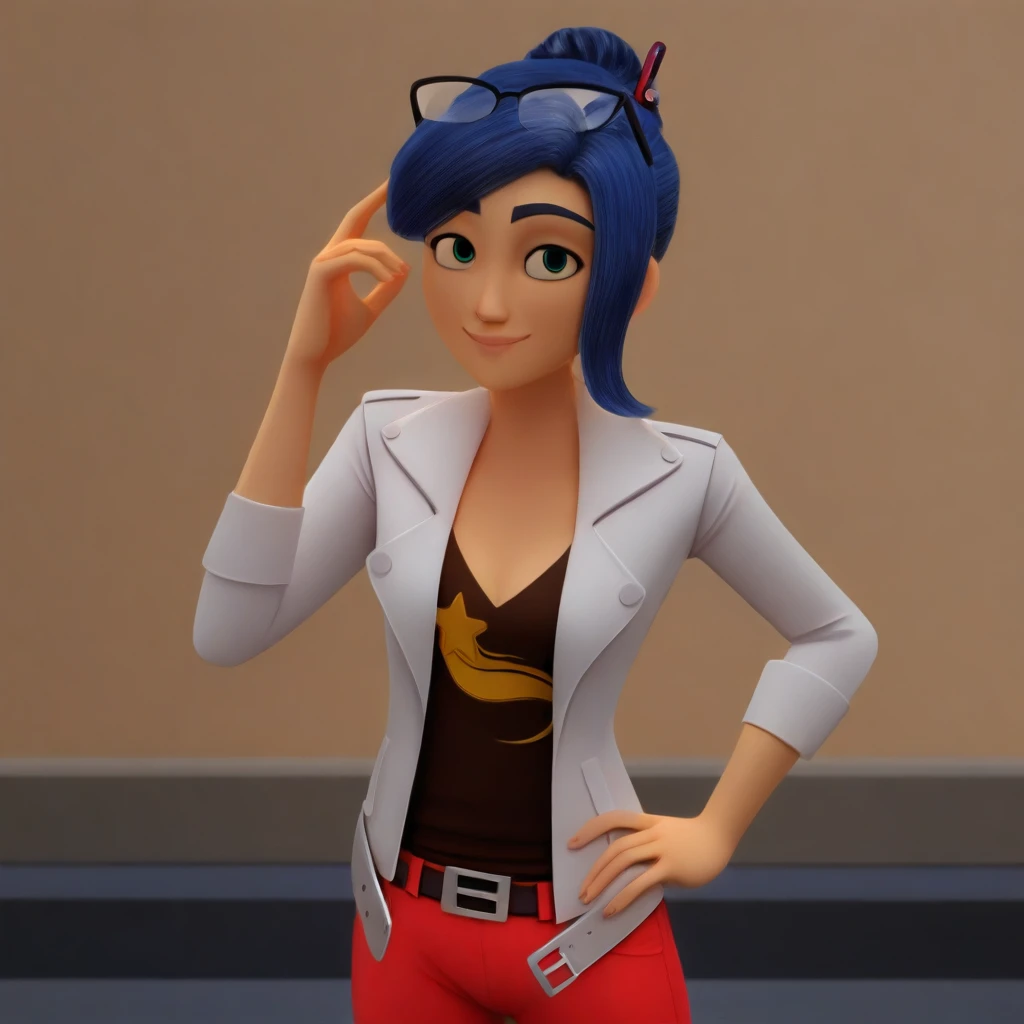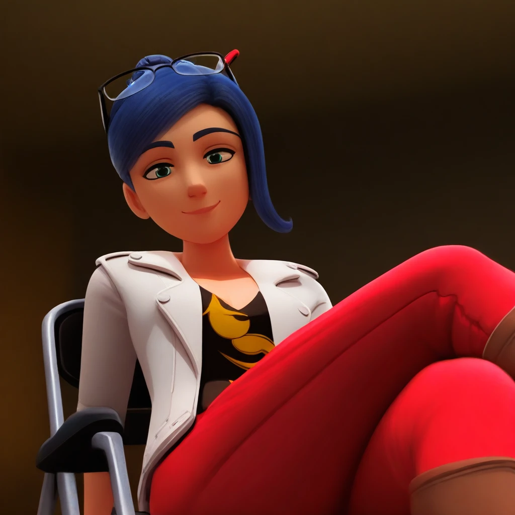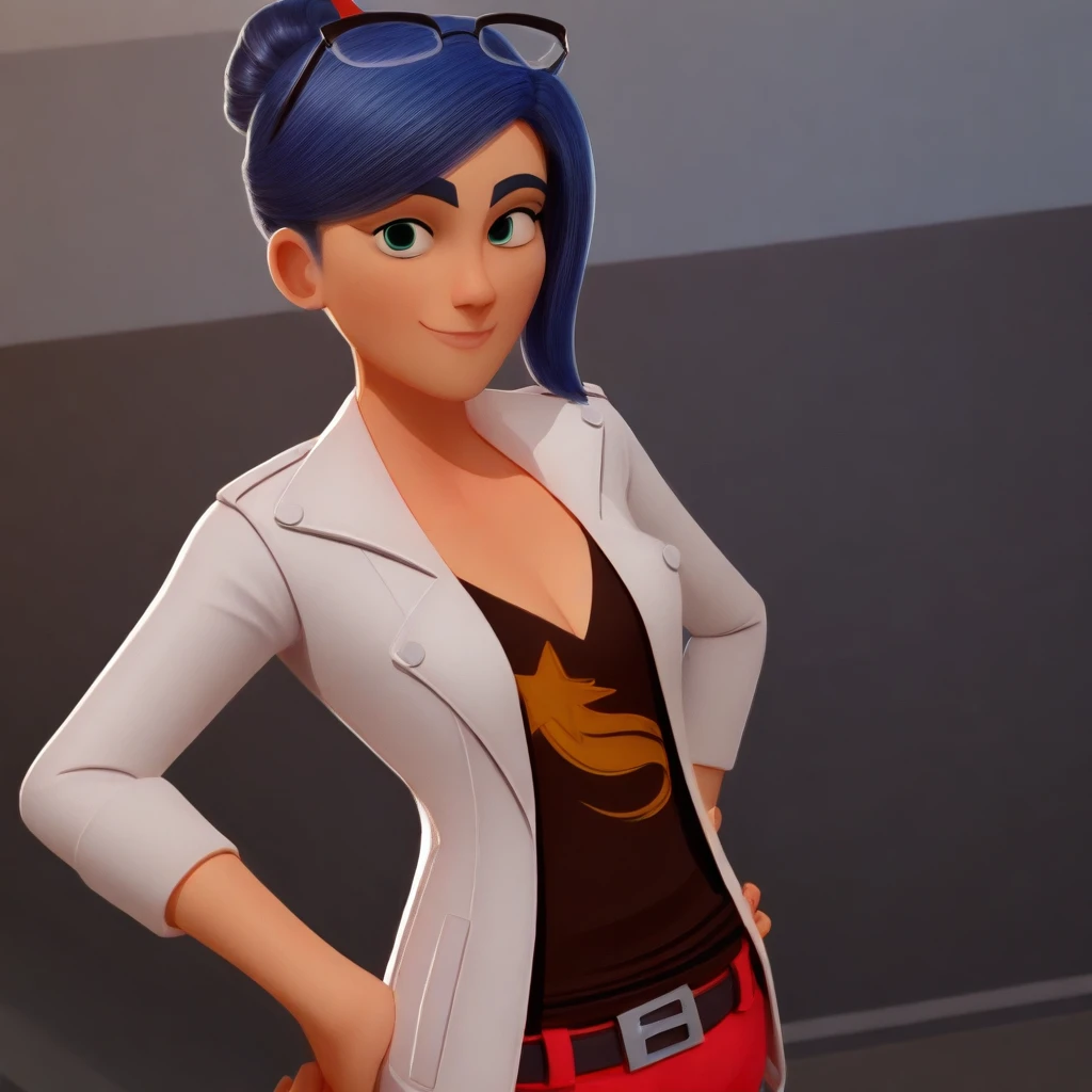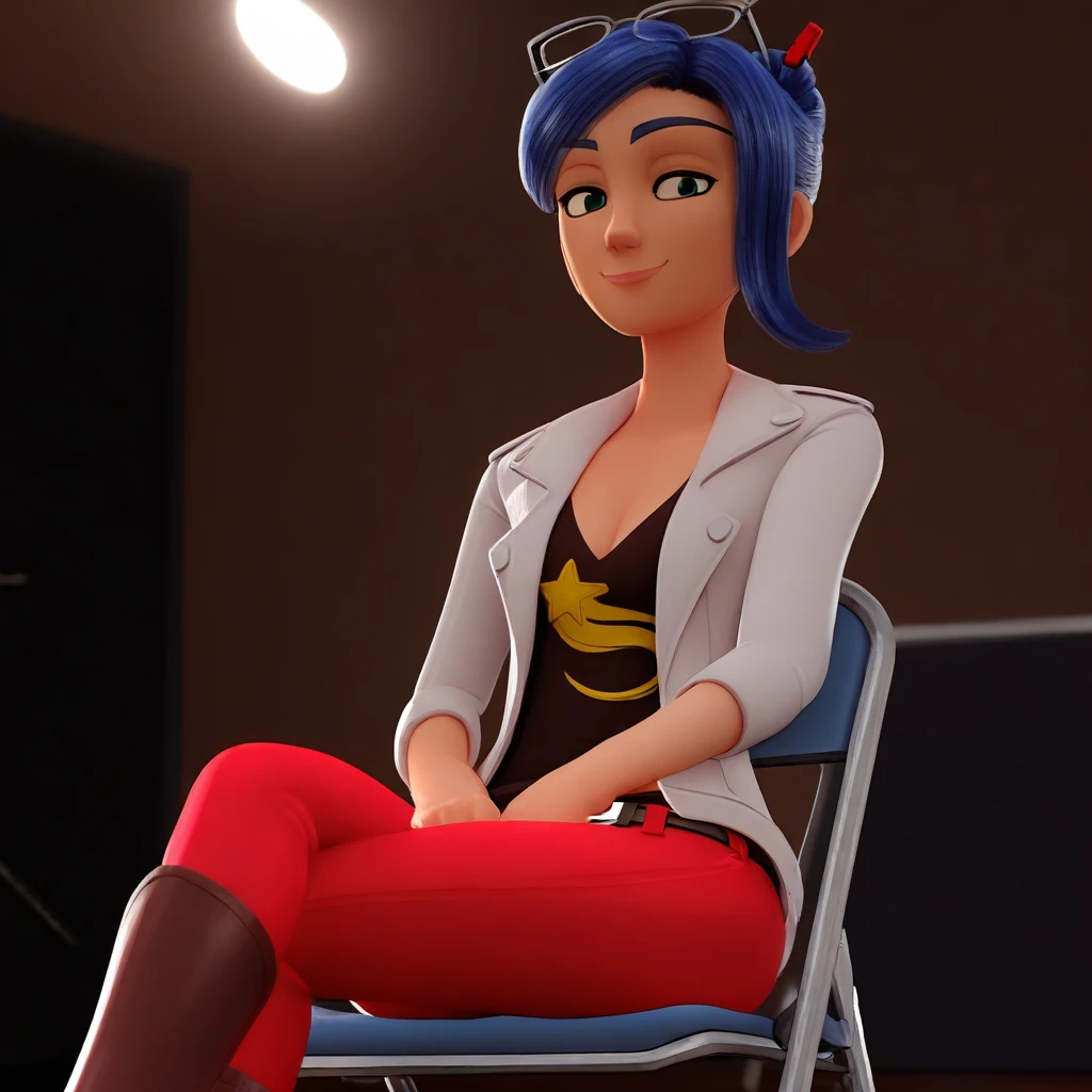 MelissaBaker, cyan eyes, blue hair, hair bun, pen in hair, glasses on head, belted jacket, low cut shirt, red pants, brown boots, belt,