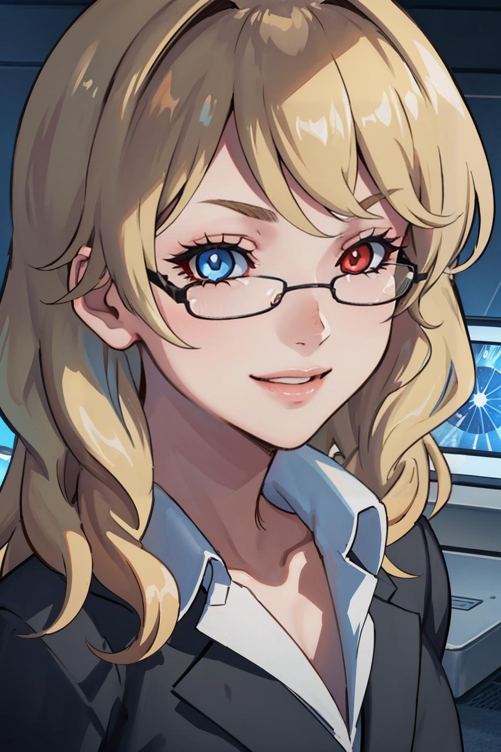 luciferimagine, glasses, black suit, pencil skirt, blue eyes, red eyes, heterochromia