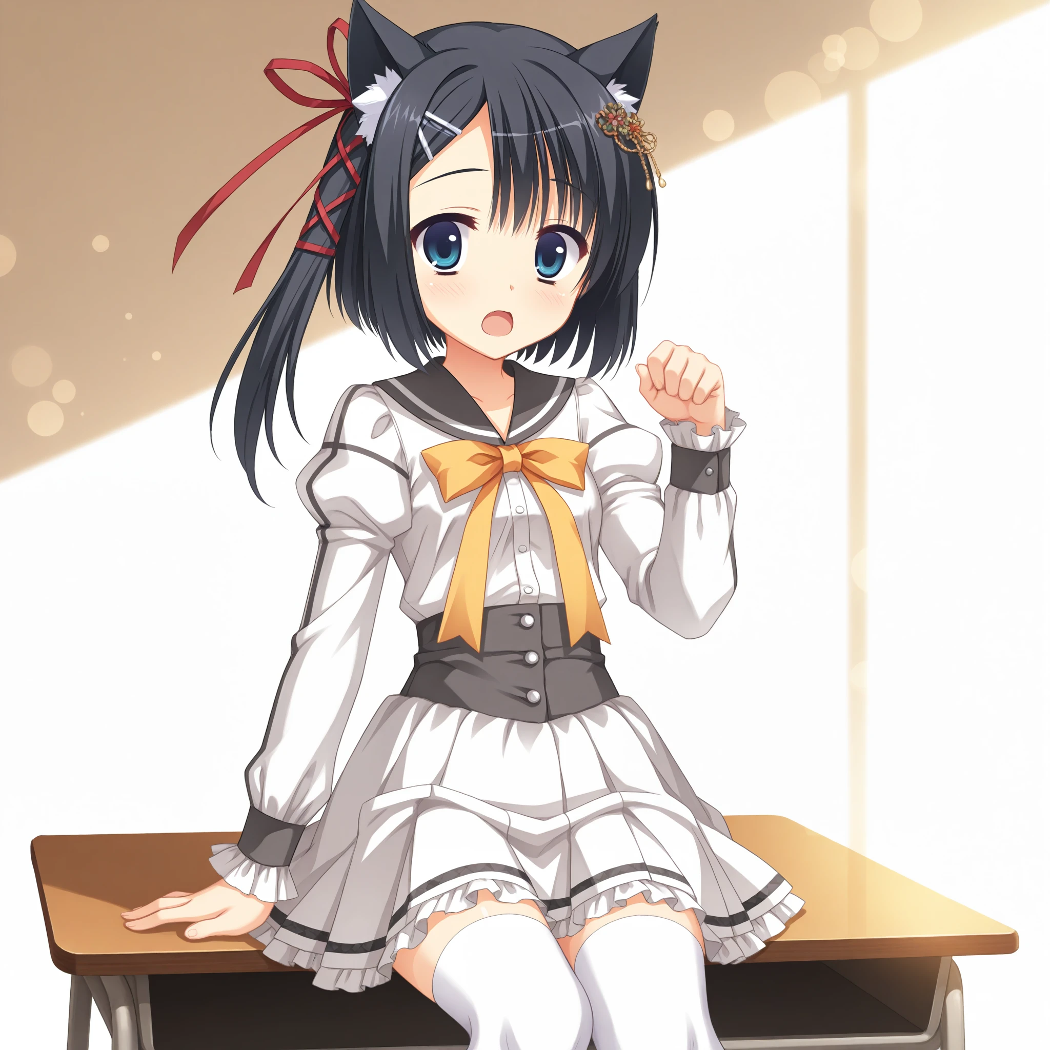 one side up,side ponytail,tassel hair ornament,hair ribbon,red ribbon,school uniform,white thighhighs,white skirt,juliet sleeves,miniskirt,white serafuku,grey sailor collar,yellow bowtie,puffy long sleeves,frilled sleeves,grey sleeve cuffs,white frills,buttons,frilled skirt,pleated skirt,grey corset,和服 (kimono)