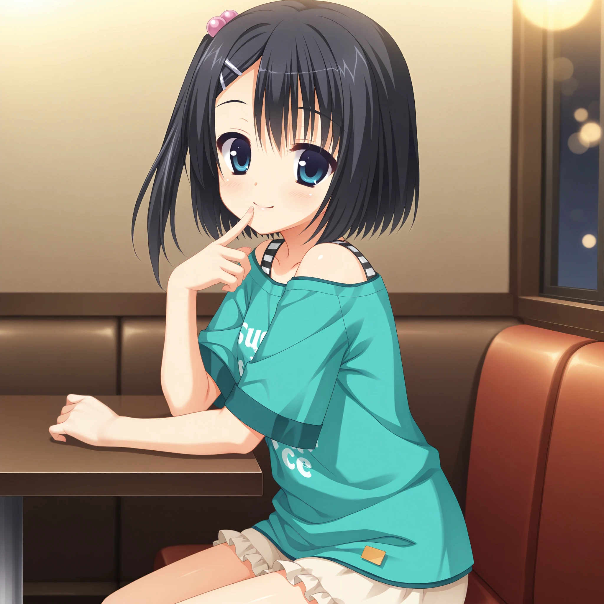 one side up,side ponytail,hair bobbles,casual,clothes writing,t-shirt,aqua shirt,off-shoulder shirt,short shorts,frilled shorts,short sleeves,striped strap,white straps,睡衣 (pajamas)