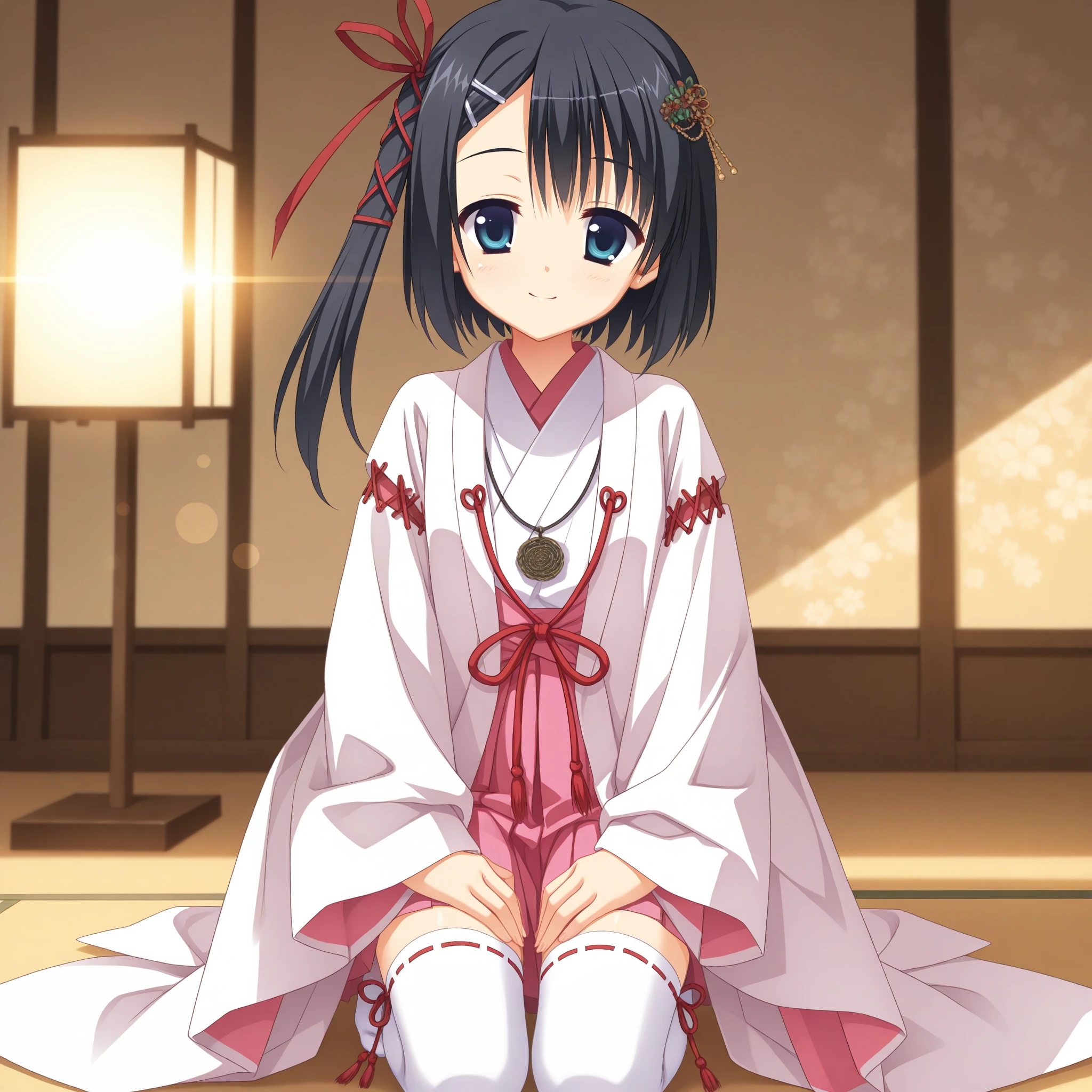 one side up,side ponytail,tassel hair ornament,hair ribbon,red ribbon,miko,white kimono,japanese clothes,wide sleeves,white thighhighs,long sleeves,pink skirt,pleated skirt,hakama short skirt,ribbon-trimmed sleeves,ribbon-trimmed thighhighs,two-sided fabric,pink lining,pink sash,layered kimono,necklace,私服 (casual)