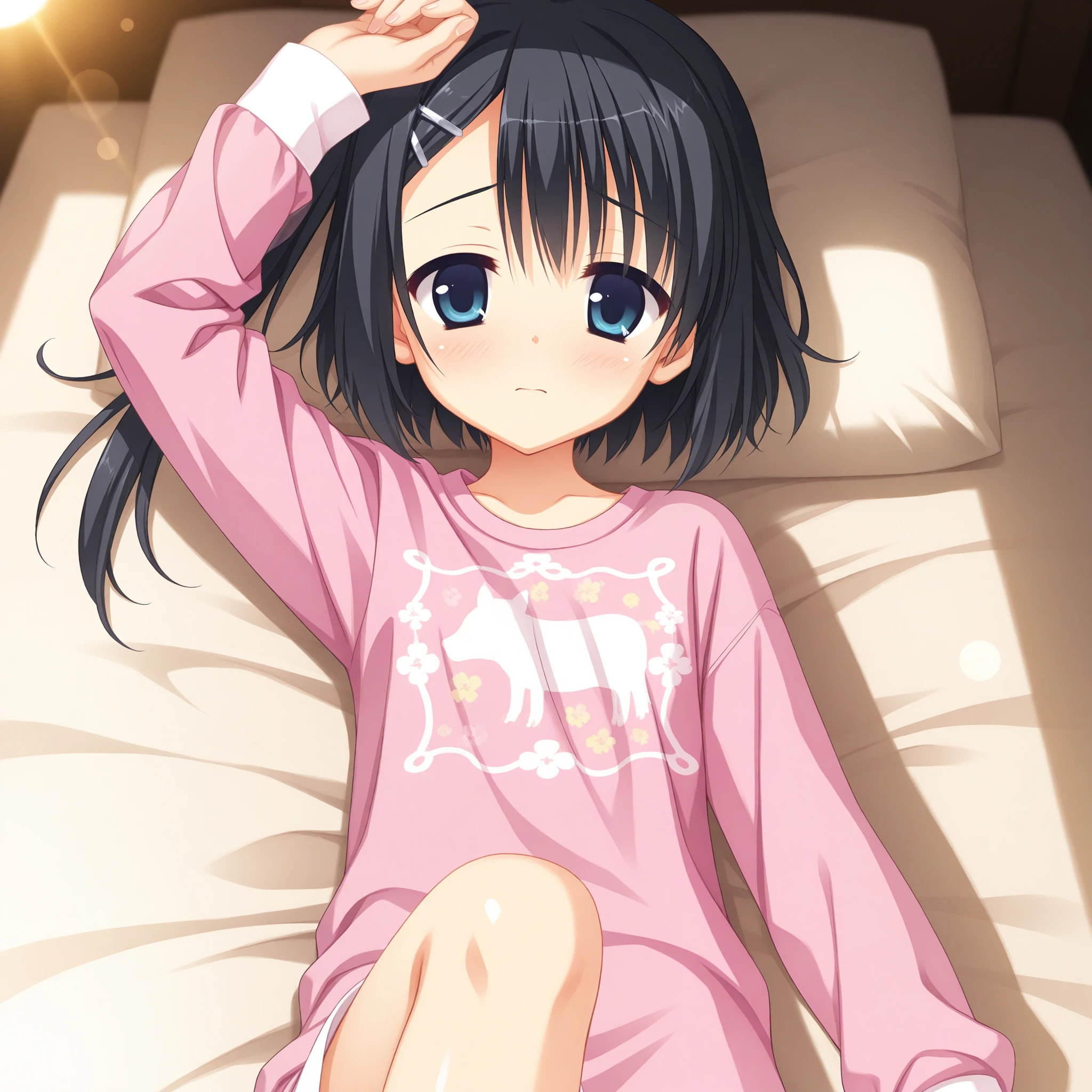 one side up,side ponytail,pink pajamas,pink shirt,long sleeves,print shirt,white sleeve cuffs,比基尼 (bikini)