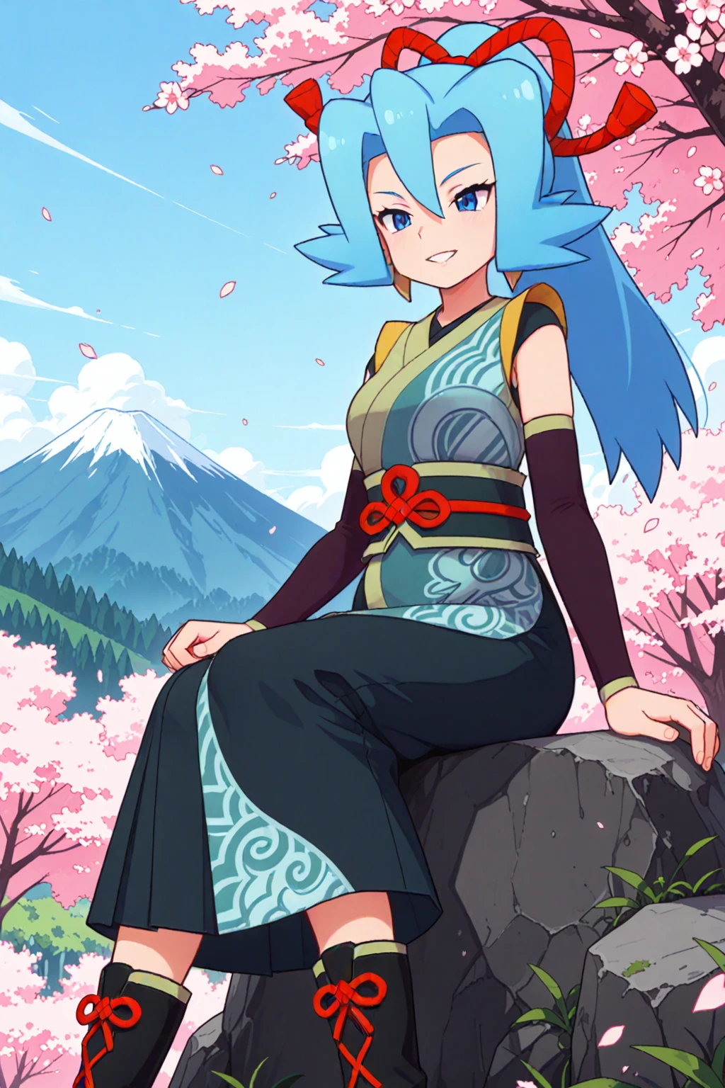 nyclair, clair \(pokemon\), blue eyes, blue hair, ponytail, bangs, hair between eyes,
