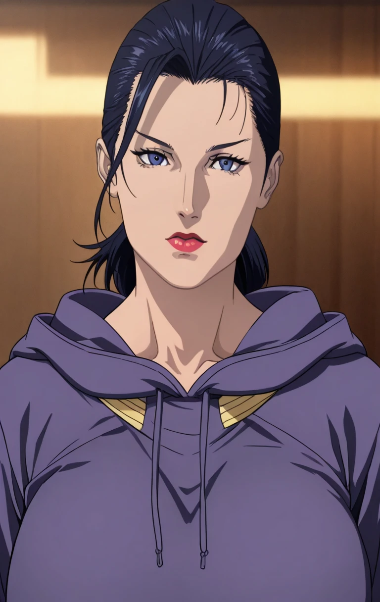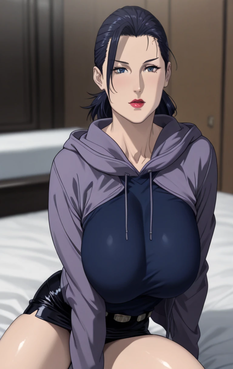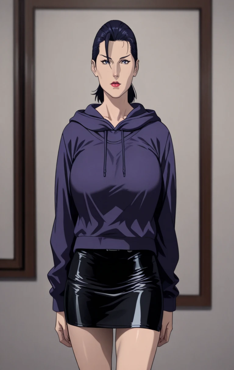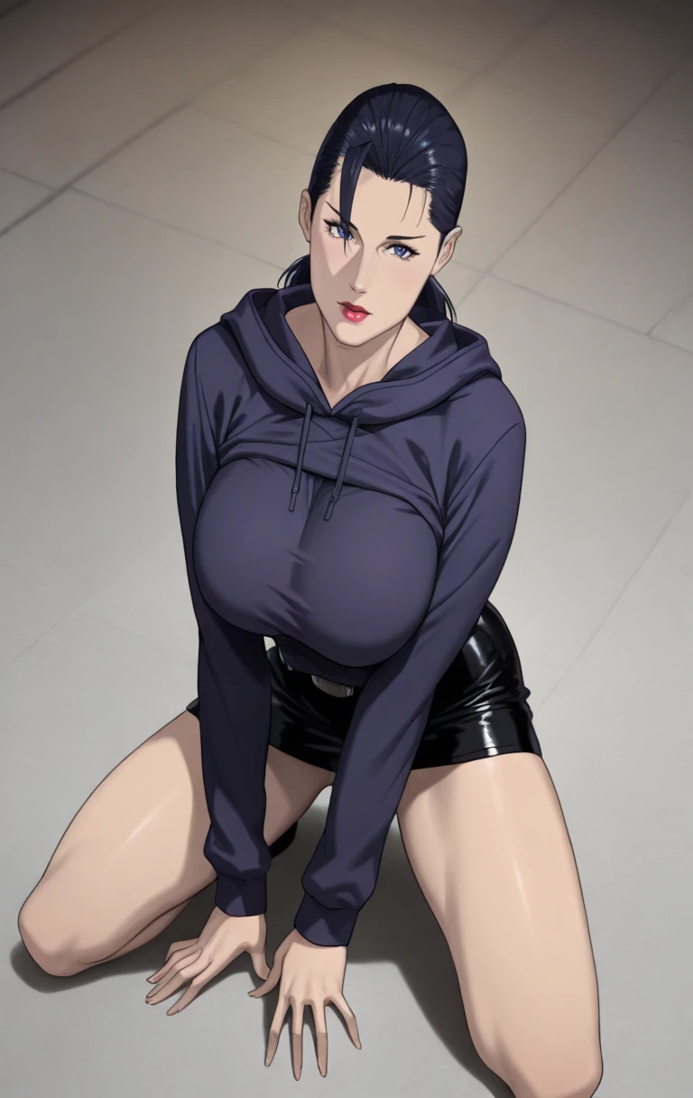 1girl, solo, looking at viewer, short hair,short black leather skirt, black hair, blue eyes, closed mouth, ponytail, lips, hoodie, red lips