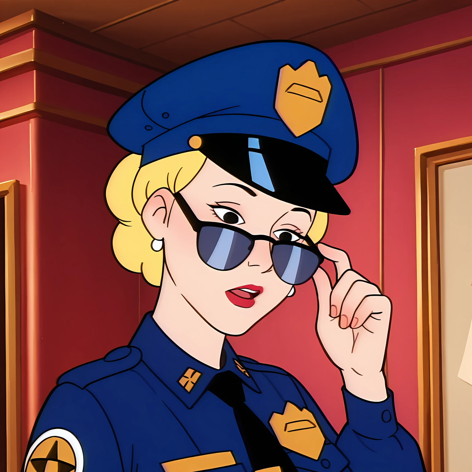belt, uniform, high heels, blue skirt, sunglasses, blue shirt, peaked cap, black necktie, side slit, blue headwear, pencil skirt