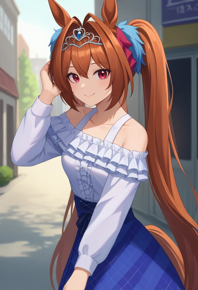 Casual Outfit: daiwacasual, twintails, tiara, horse ears, frills, white shirt, off-shoulder shirt, blue skirt, plaid, horse tail