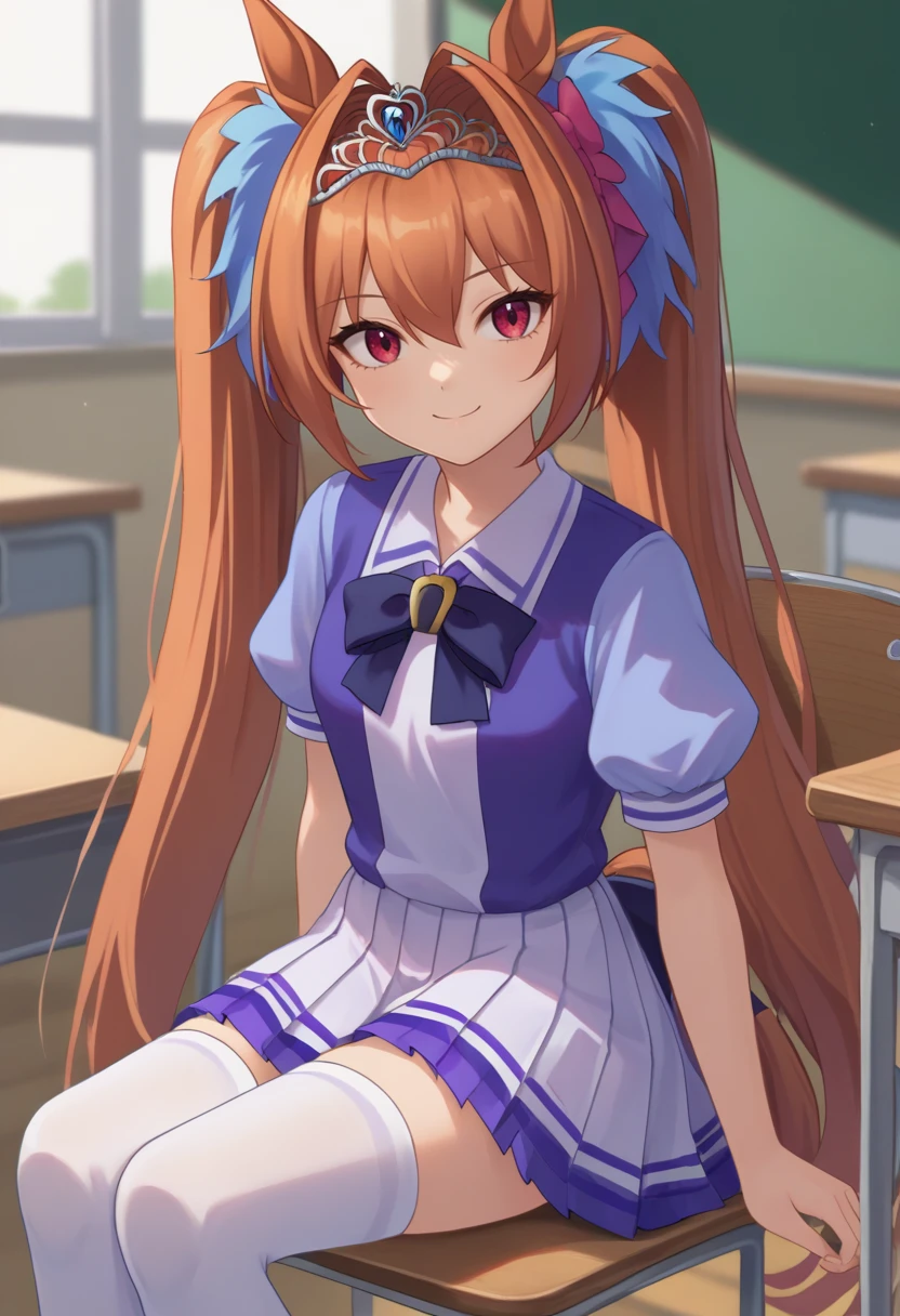 Tracen School Uniform: daiwatracen, twintails, tiara, horse ears, tracen school uniform, purple shirt, bow, puffy short sleeves, white skirt, white thighhighs, horse tail