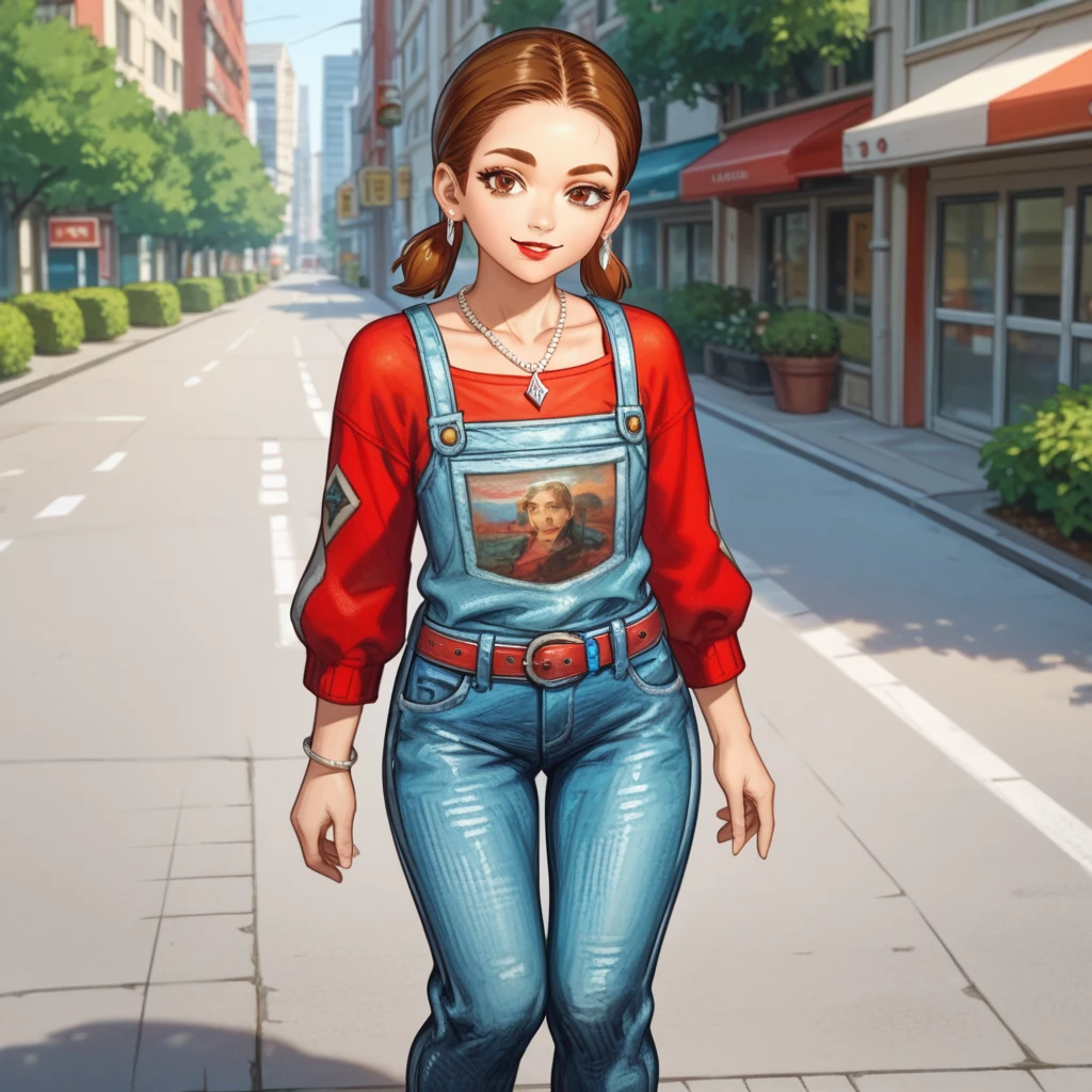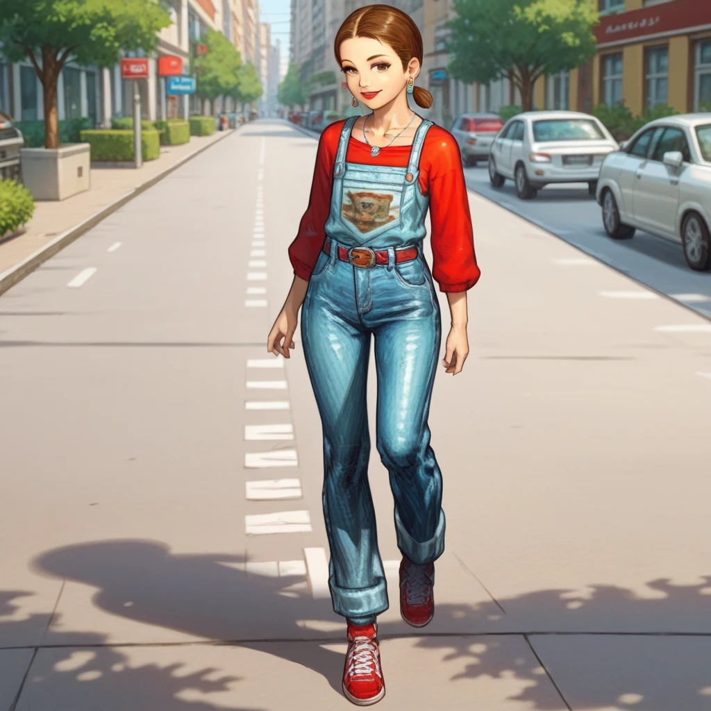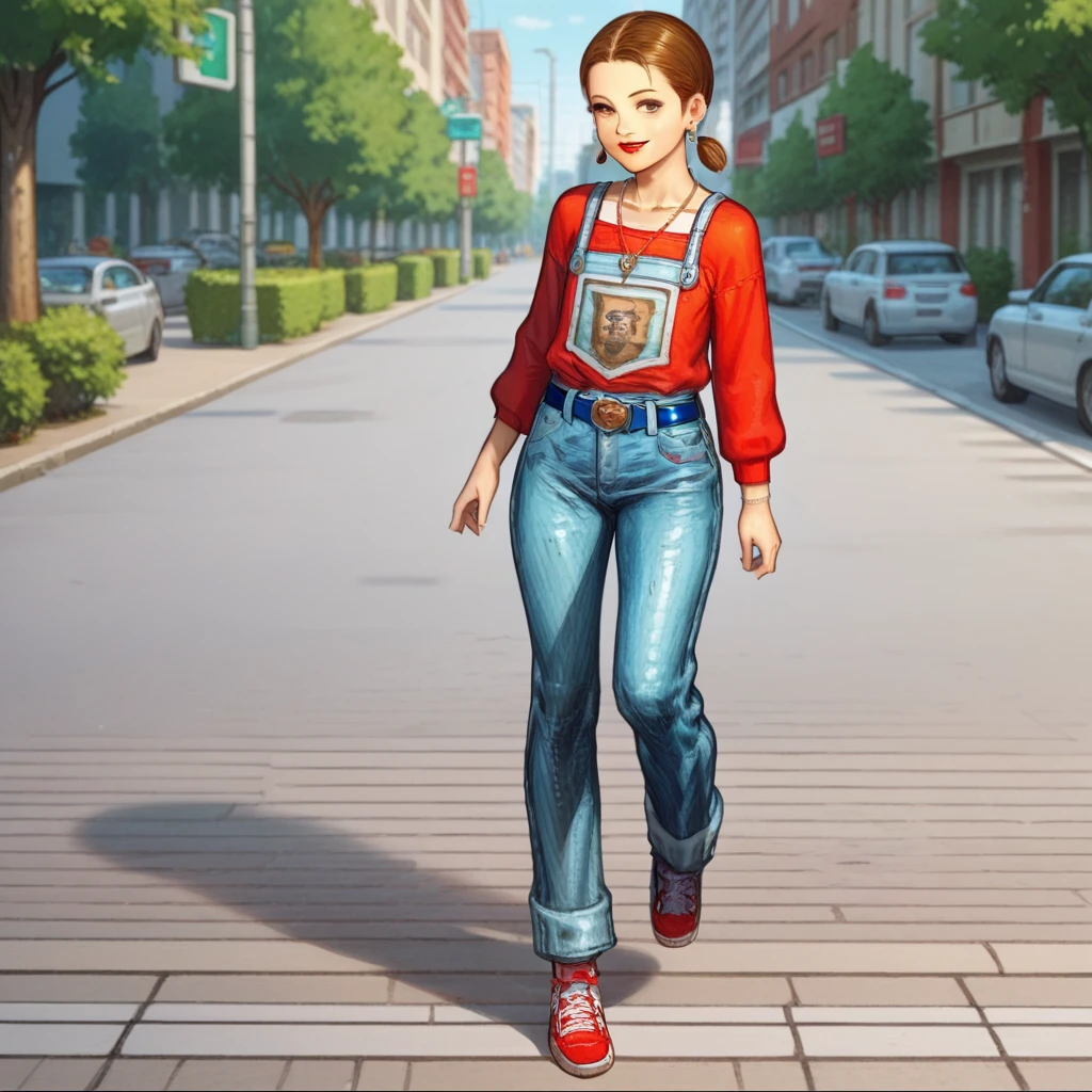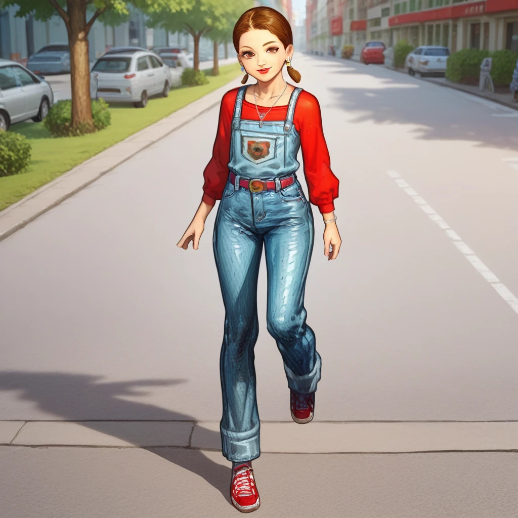 Long Sleeves Blue Neckline Shirt, Shirt Tucked In, Red Denim Jacket, Long Length Jeans, Red Denim High-Waist Jeans, Blue Belt, Red and White Sneakers