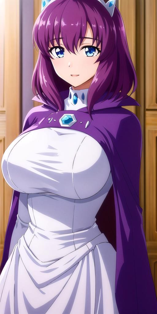 • White_turtleneck_dress_White_thighhighs_White_garter_straps_Tiara_Purple_cape: Her normal dress but with her purple cape.