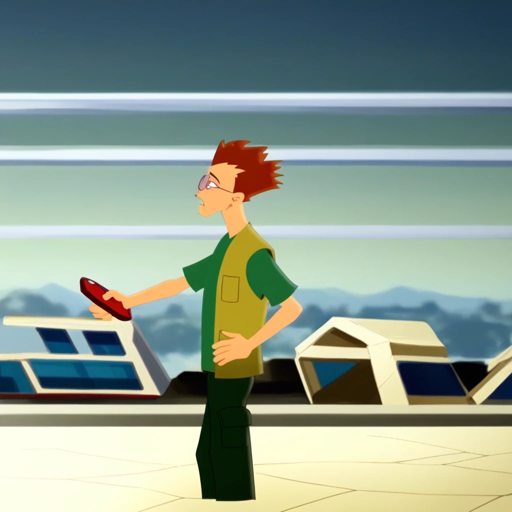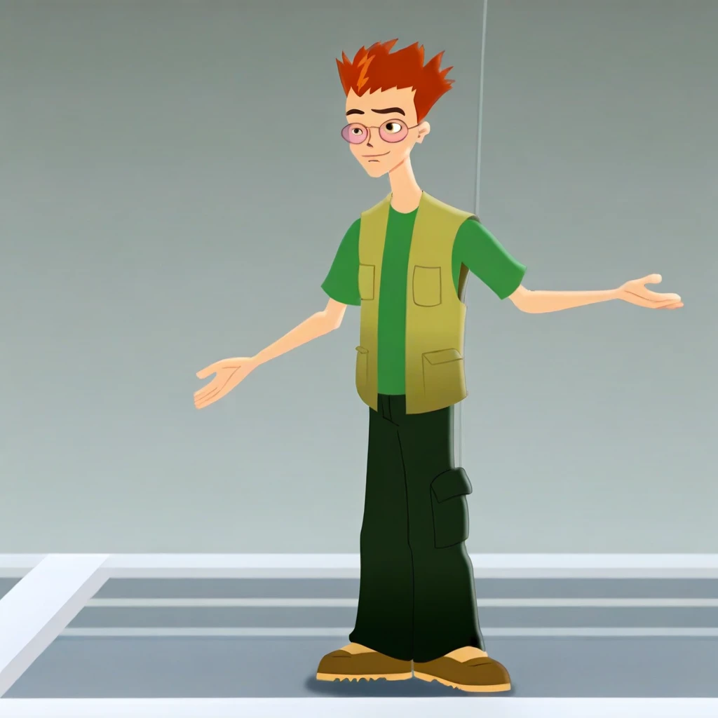 KidChaor, spiky orange hair, brown eyes, pink-tinted glasses, green t-shirt, olive vest, dark green cargo pants, brown shoes, 1boy, solo,