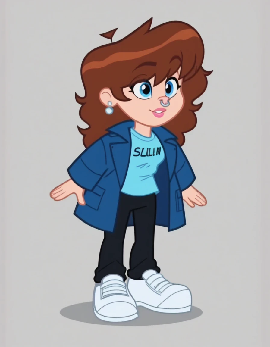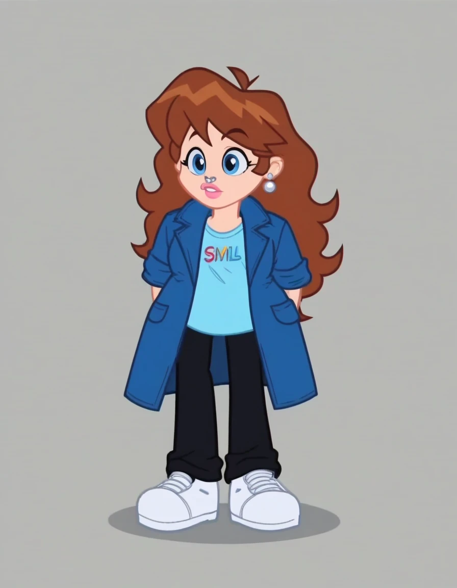 Elaina_Keyes_SML, 1girl, blue eyes, brown hair, shirt, long hair, jacket, open clothes, shoes, pants, coat, white footwear, light blue shirt, dark blue coat, text on shirt, black pants, pink lips, nose piercing, jewelry, silver earrings,