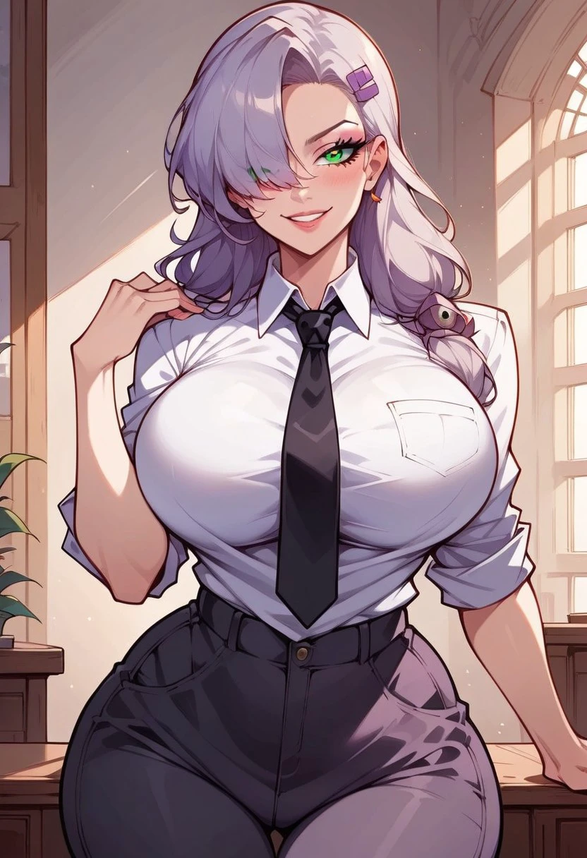 Promt: NaoNk, gray hair, long hair, hair over one eye, green eyes, large breasts, suit on shoulder,black necktie, shirt, collared shirt, black_pants, sleeves rolled up, black_pants,