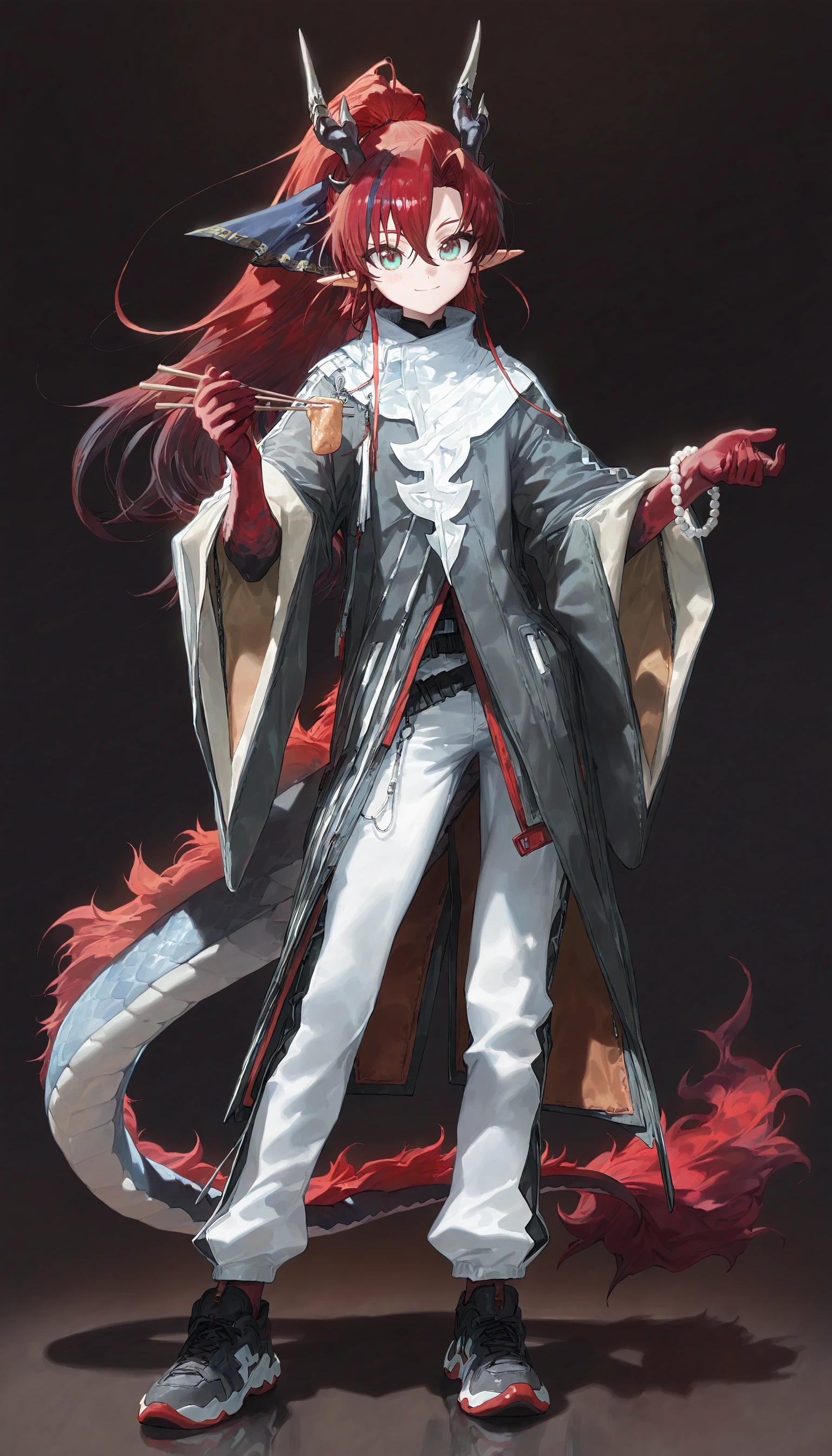 yu_\(arknights\) , green eyes,red hair ,pointy ears, multicolored hair,dragon horns, ponytail ,dragon tail,streaked hair , long grey coat, wide sleeves,bead bracelet,white pants, beads,colored skin,sneakers, holding chopsticks,