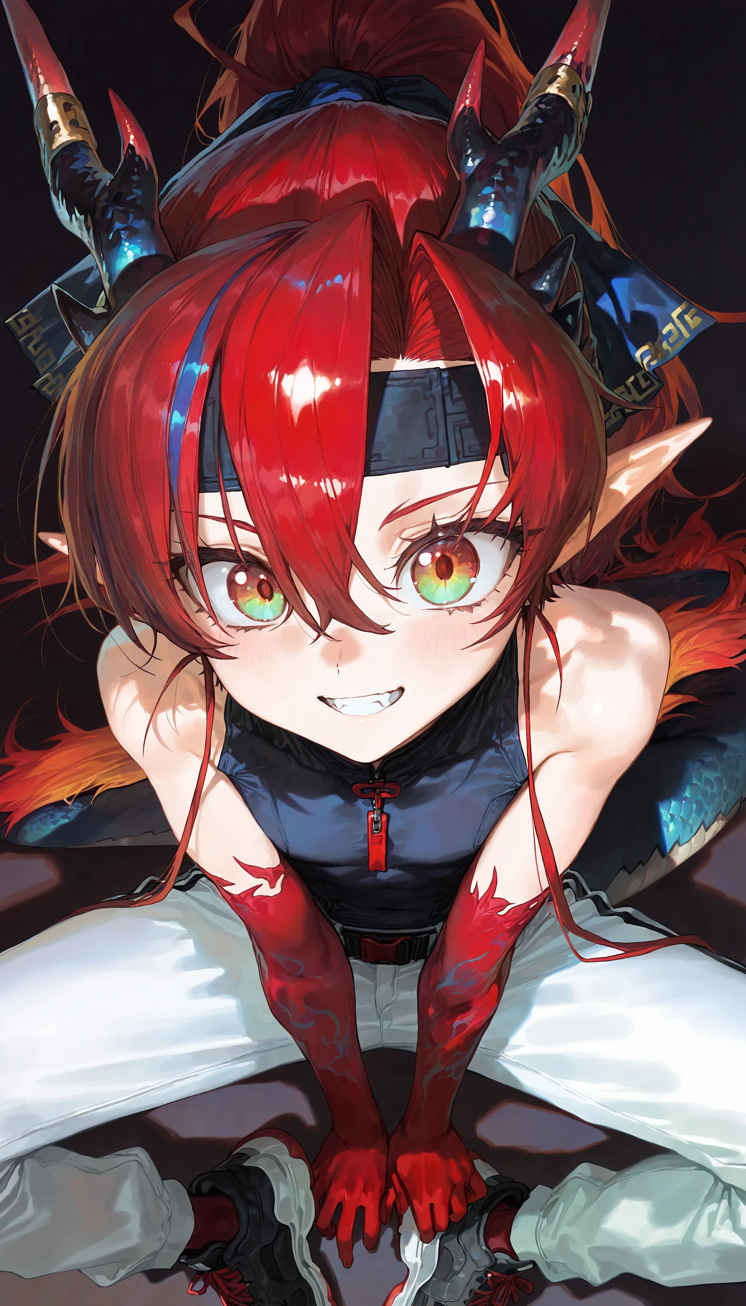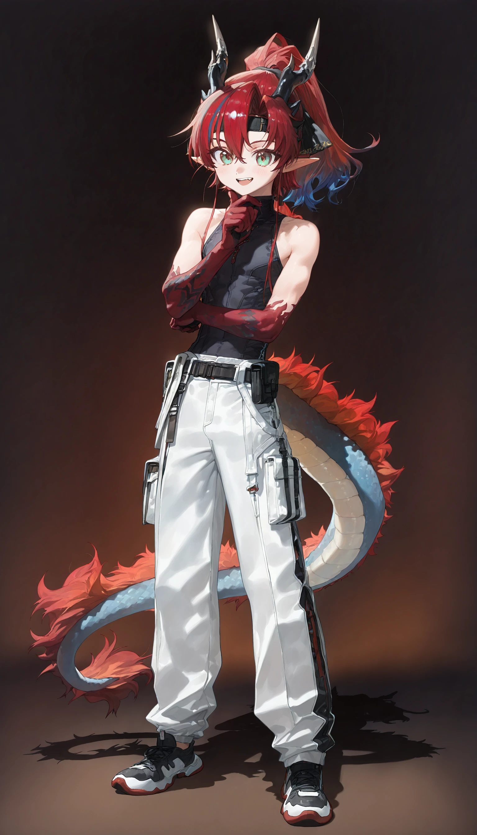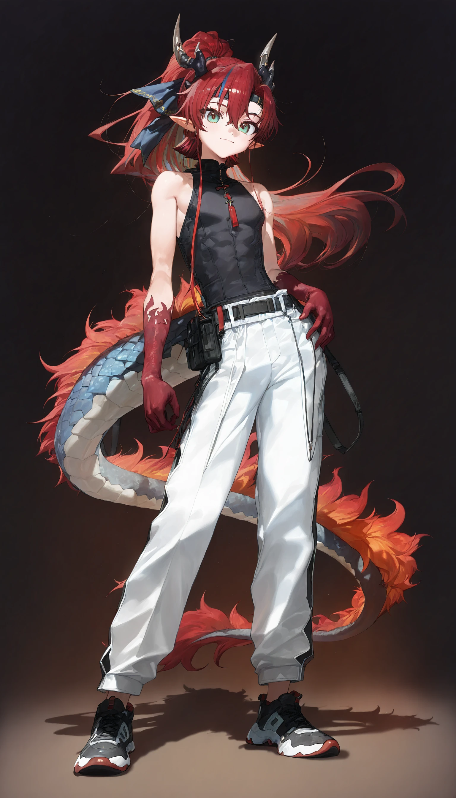 yu_\(arknights\) , green eyes,red hair ,pointy ears, multicolored hair,dragon horns, ponytail ,dragon tail,streaked hair , headband,sleeveless shirt ,white pants ,sneakers,