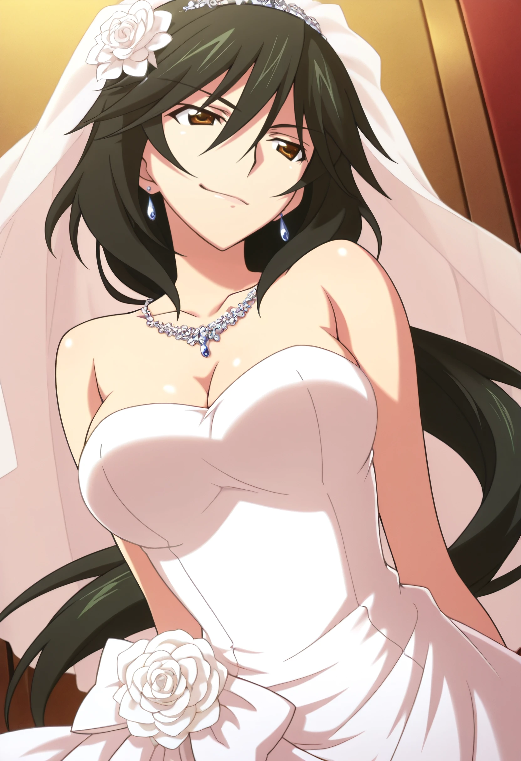 ChifuyuDress, wedding dress, veil, dress, bridal veil, jewelry, strapless dress, earrings, strapless, ponytail, cleavage, bare shoulders, hair ornament, low ponytail, hair flower, white dress,