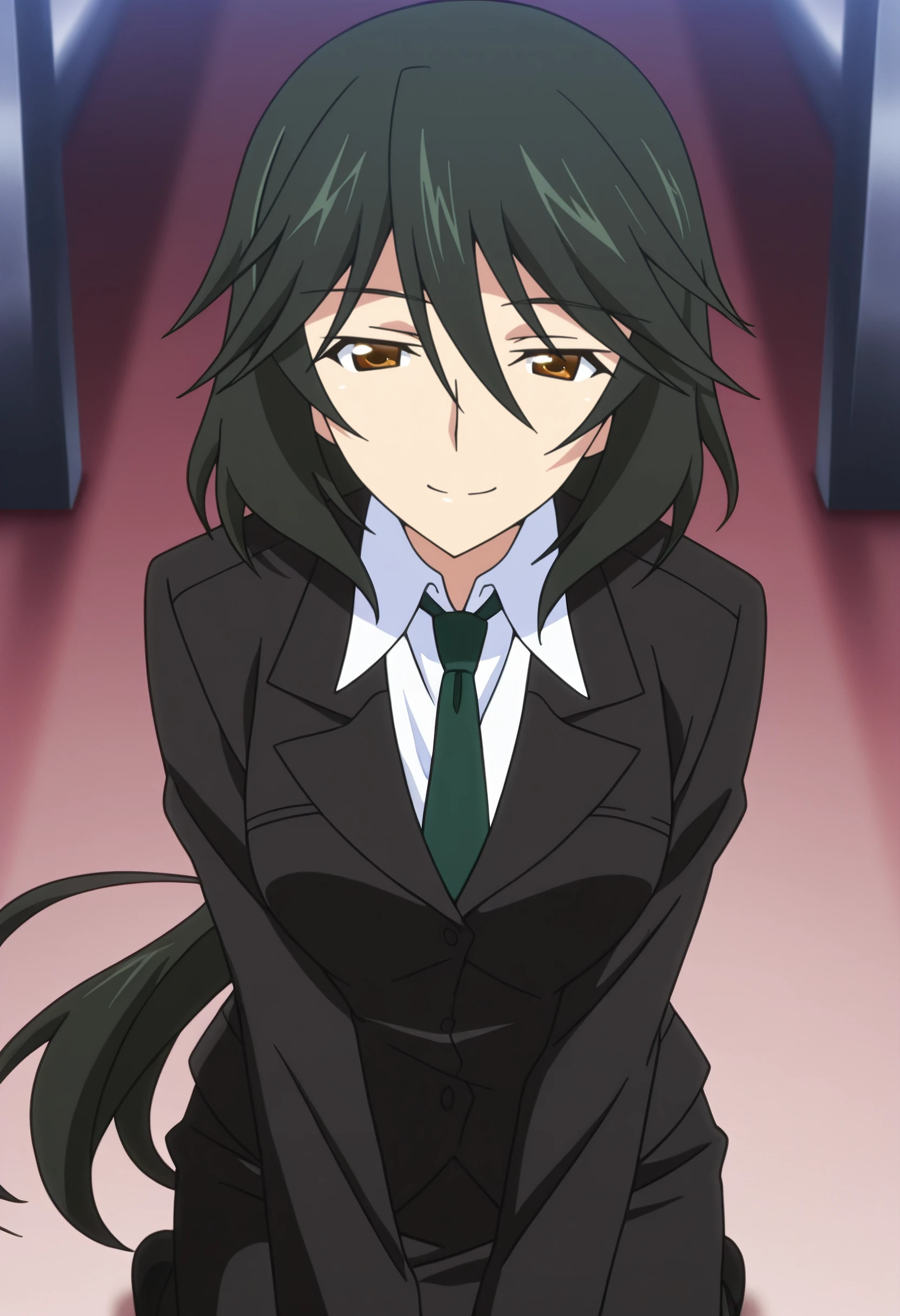 ChifuyuSuit, formal clothes, suit, jacket, necktie, shirt, black jacket, white shirt, collared shirt, green necktie, dress shirt, skirt suit, business suit, blazer, skirt, ponytail, pencil skirt, low ponytail, black skirt,