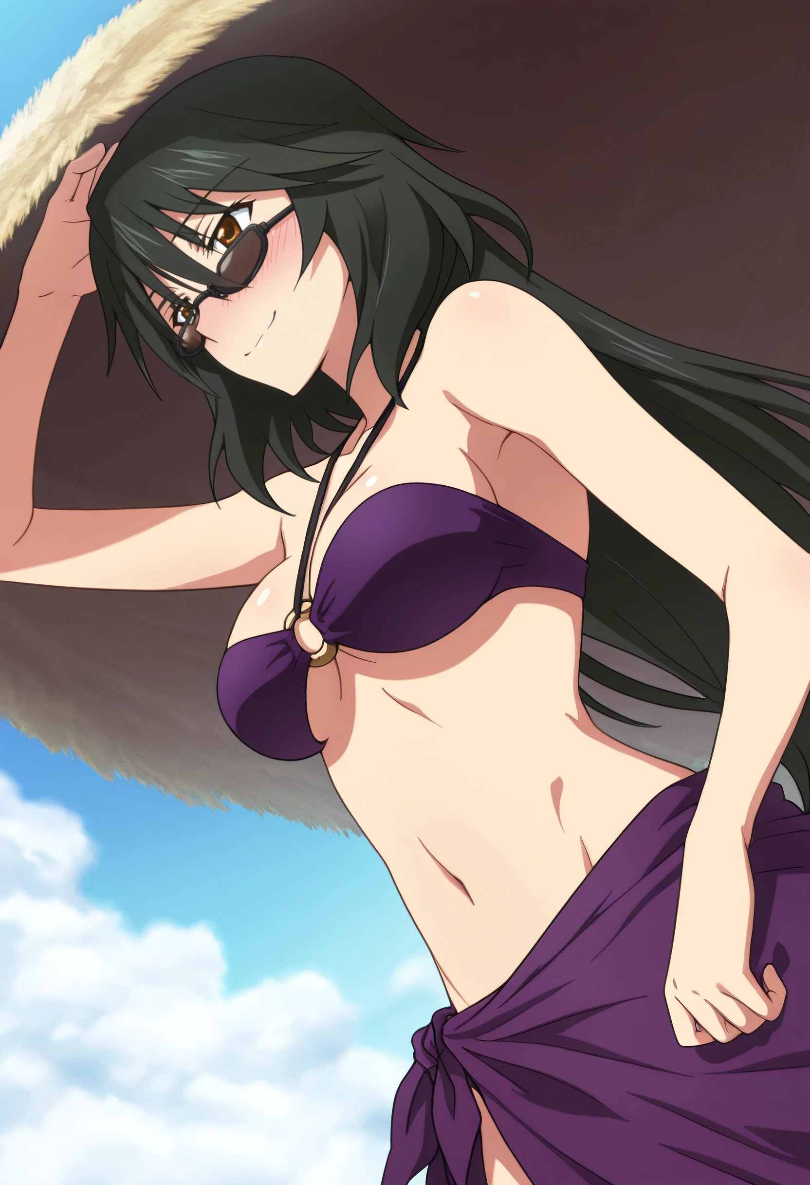 ChifuyuSwimwearB, swimsuit, sunglasses, bikini, sarong, navel, cleavage, purple bikini, o-ring, glasses, o-ring bikini, o-ring top, black-framed eyewear, bare shoulders, purple sarong,