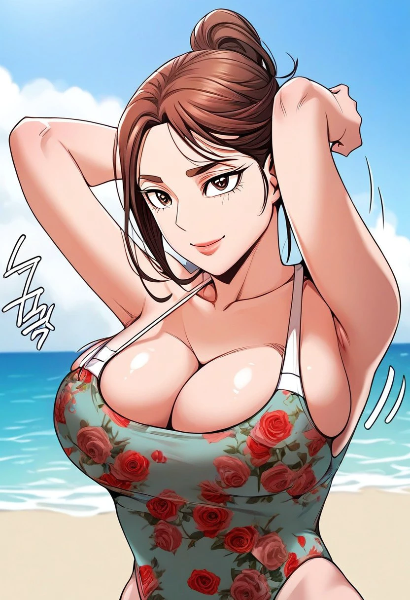 Oh Yu-Ra: oh_yu-ra, beautiful amber eyes, beautiful brown hair, beautiful long hair, bangs, huge and shaggy breasts,