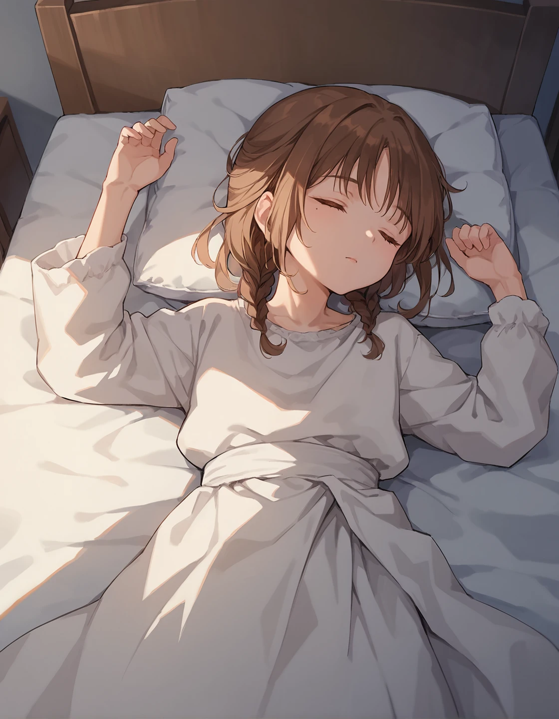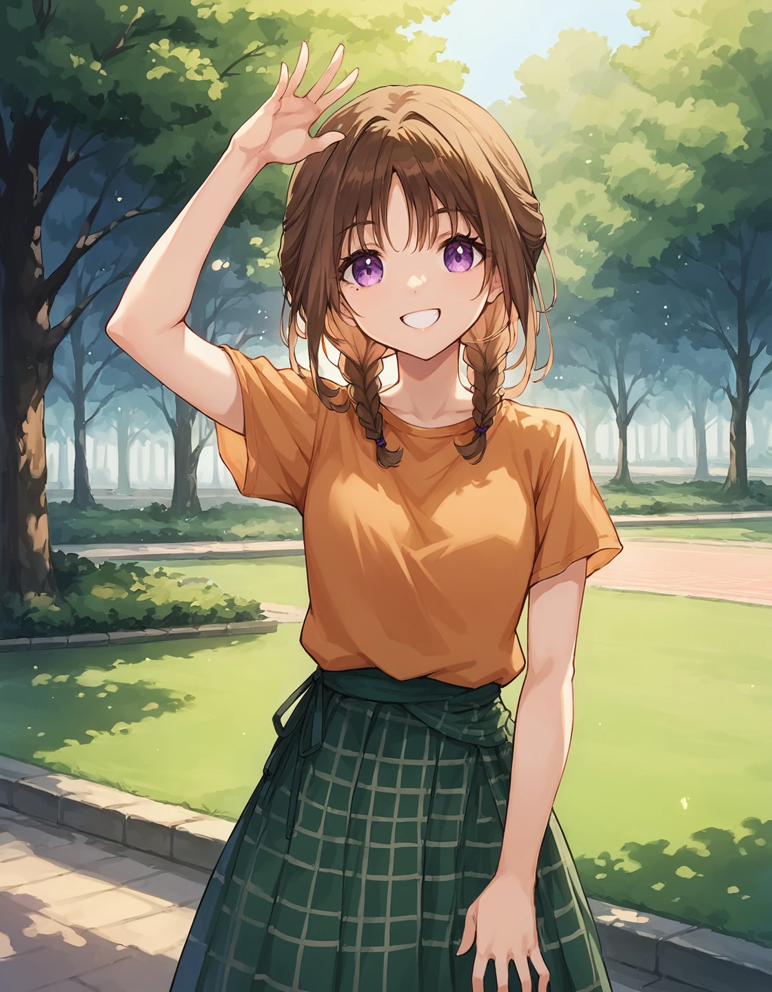 Appearance: brown hair, low twin braids, purple eyes, mole under eye