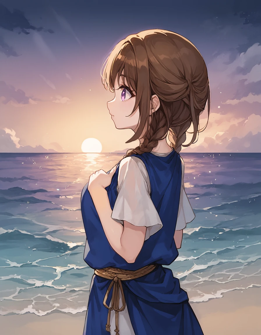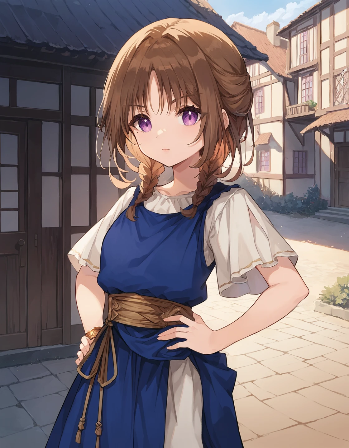 mgrcamaryllis, brown hair, low twin braids, purple eyes, mole under eye, white shirt, blue tabard, yellow rope belt, bronze bracelet