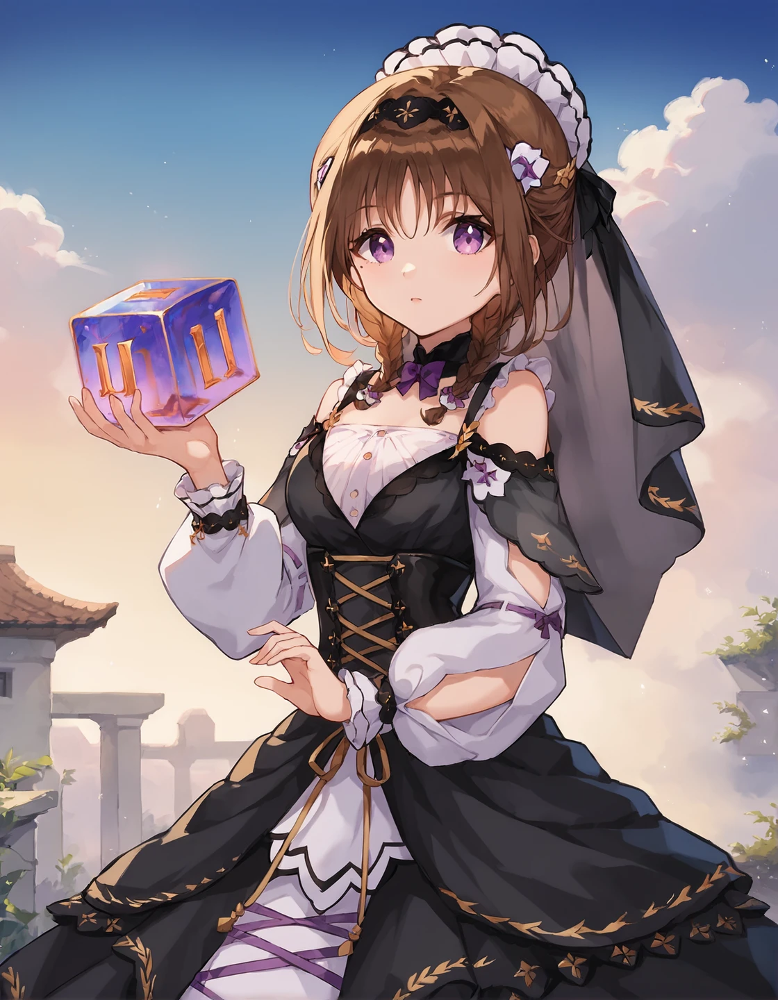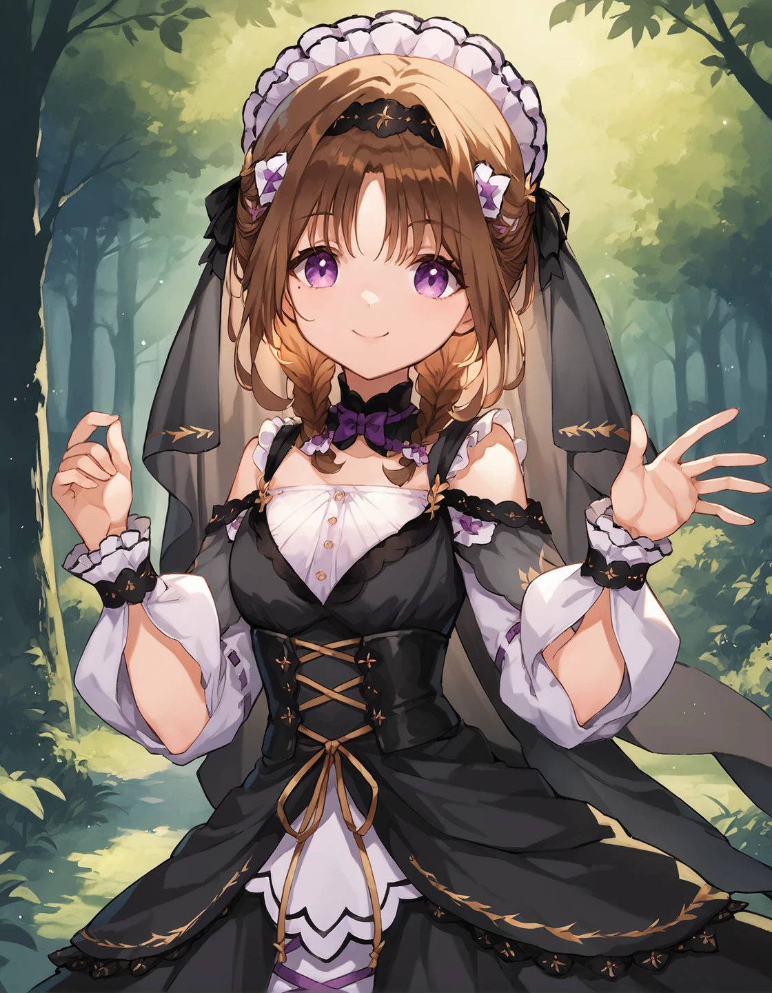 mgrcamaryllis, brown hair, low twin braids, purple eyes, mole under eye, white hair ornament, black hairband, black veil, black detached collar, black with white frilled dress, shoulder cutout, black cross-laced corset, purple bowties, purple ribbon trim
