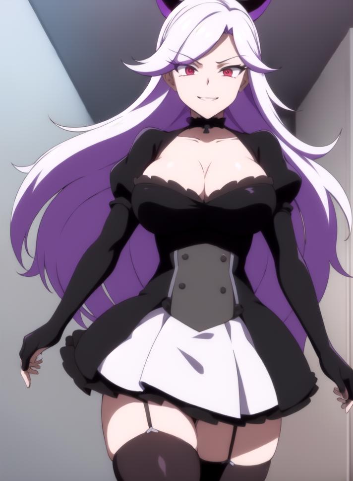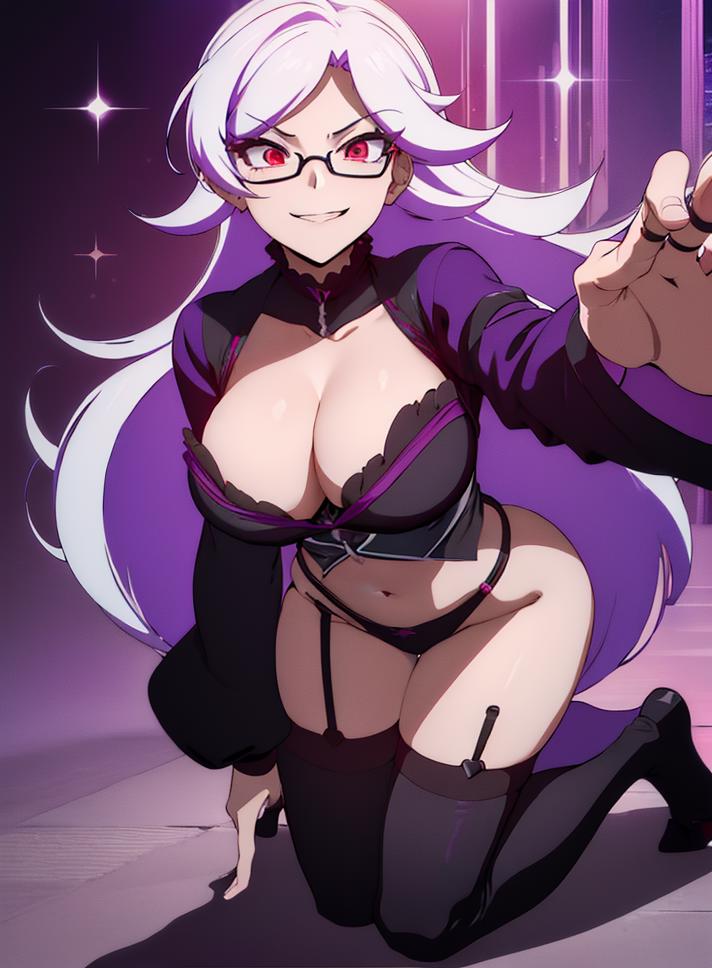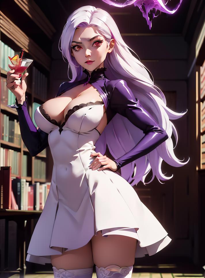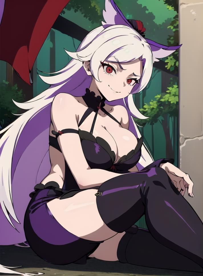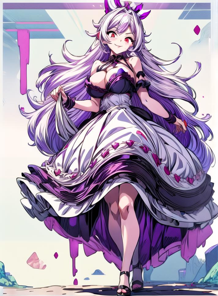 Appearance: 1girl, red eyes, breasts, long hair, looking at viewer, cleavage, large breasts, white hair, purple hair, very long hair, cat ears