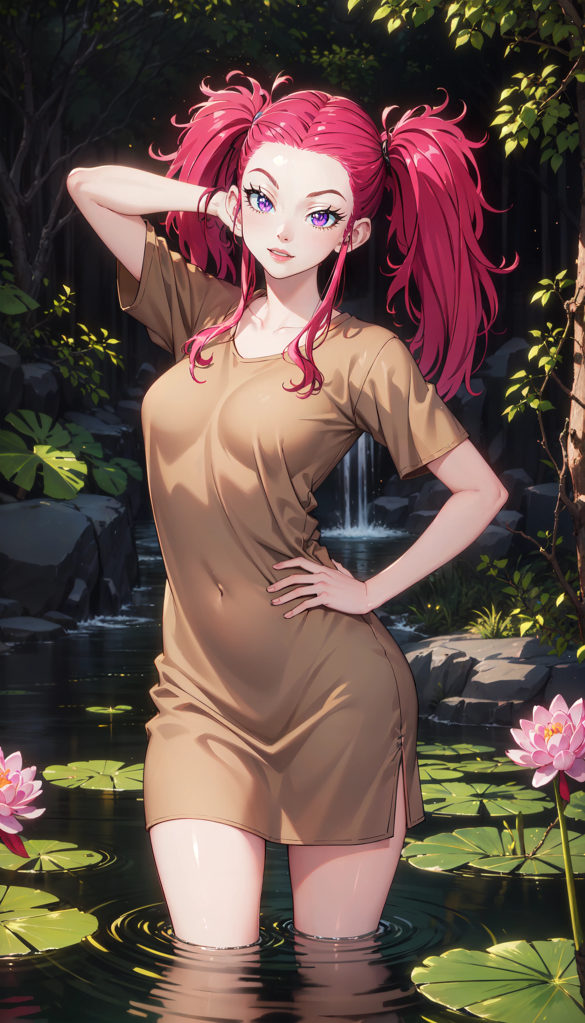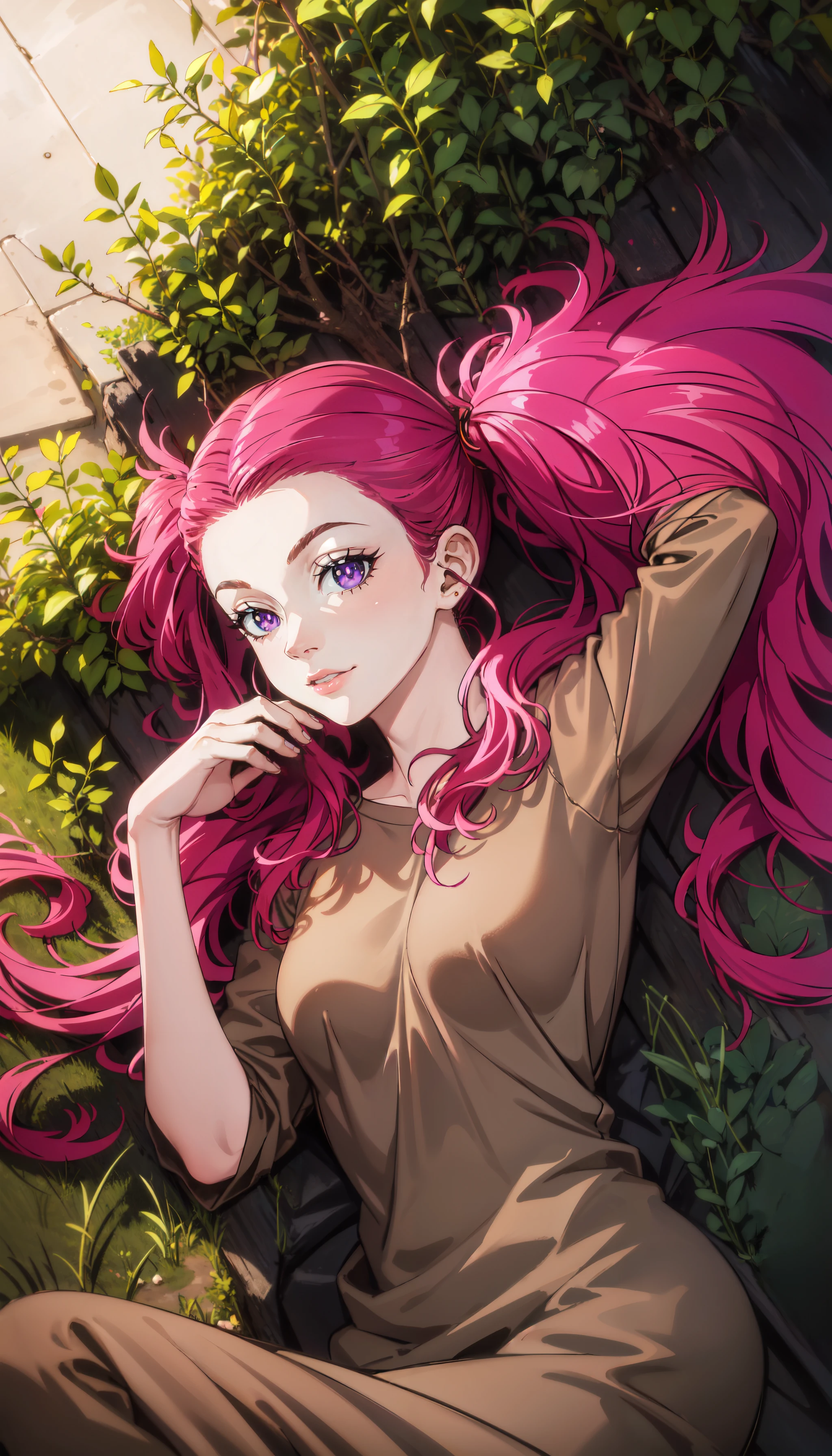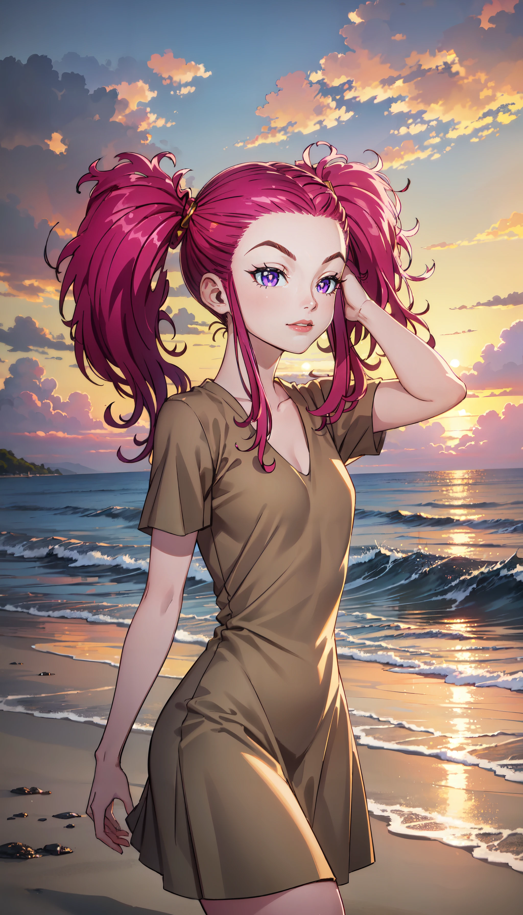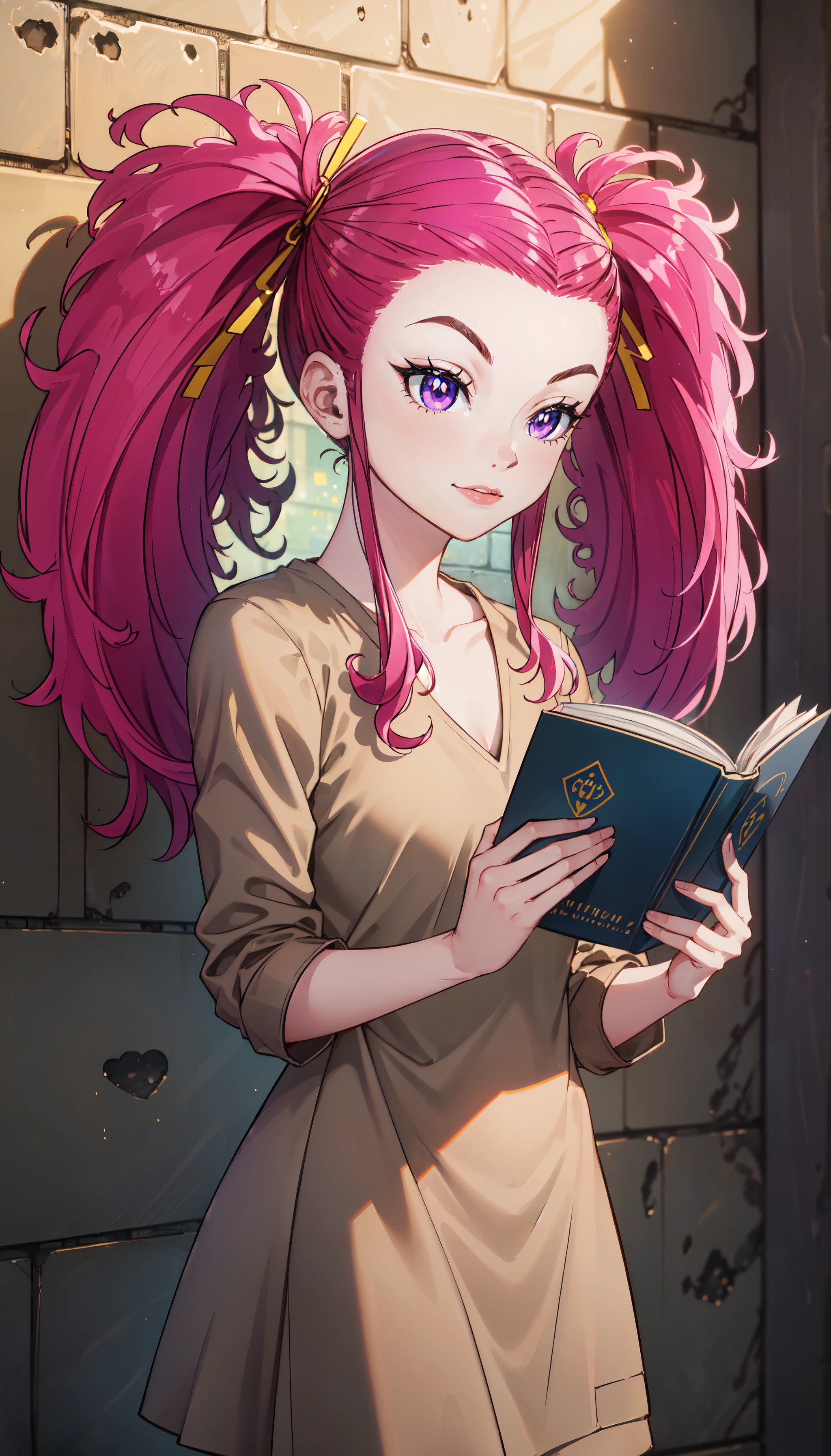 pink hair, twintails, purple eyes, brown dress, prison dress, rag dressDescription