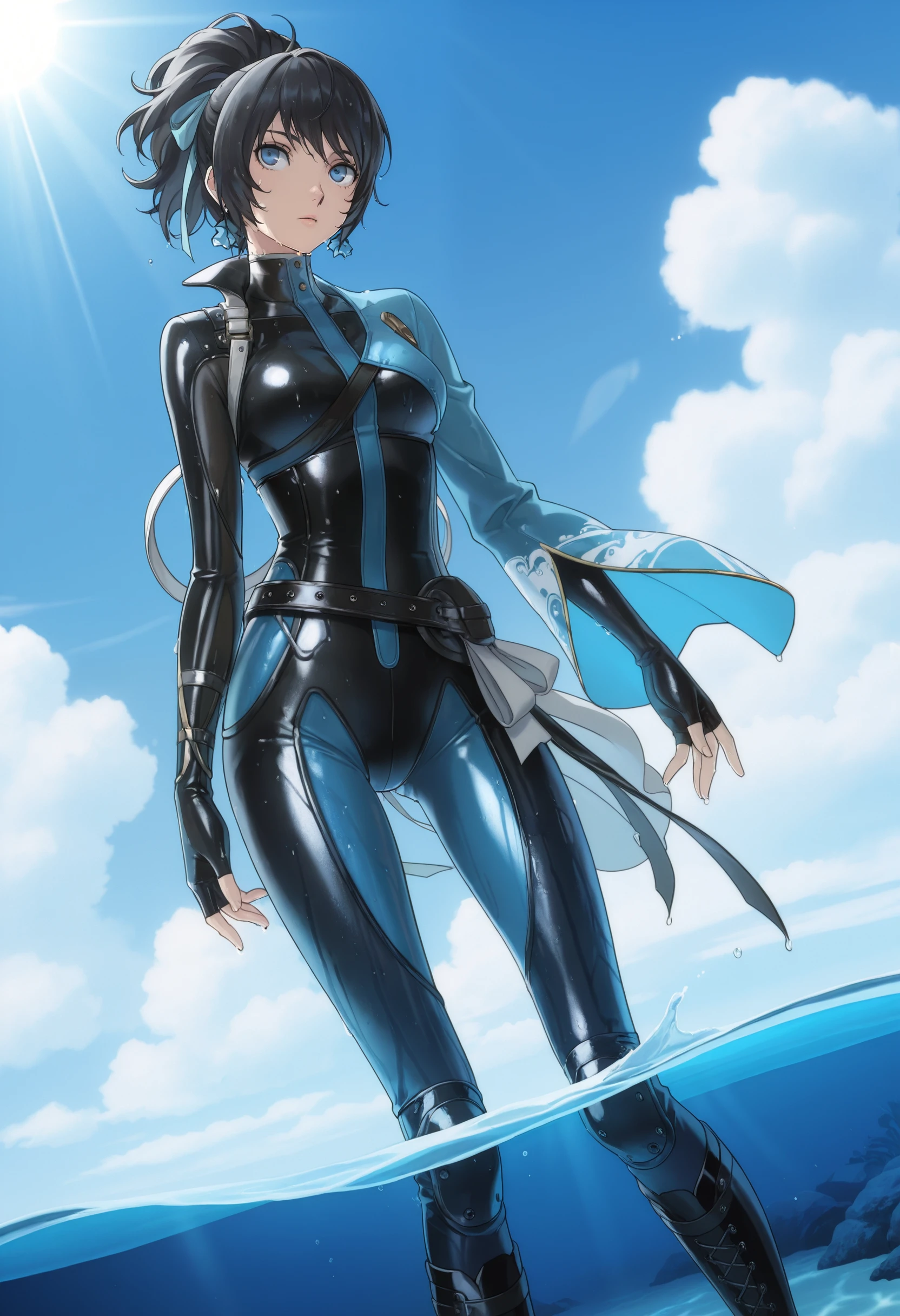 phantomoutfit, diving suit, wetsuit, , single detached sleeve, belt, back ribbon, hair ribbon, knee boots