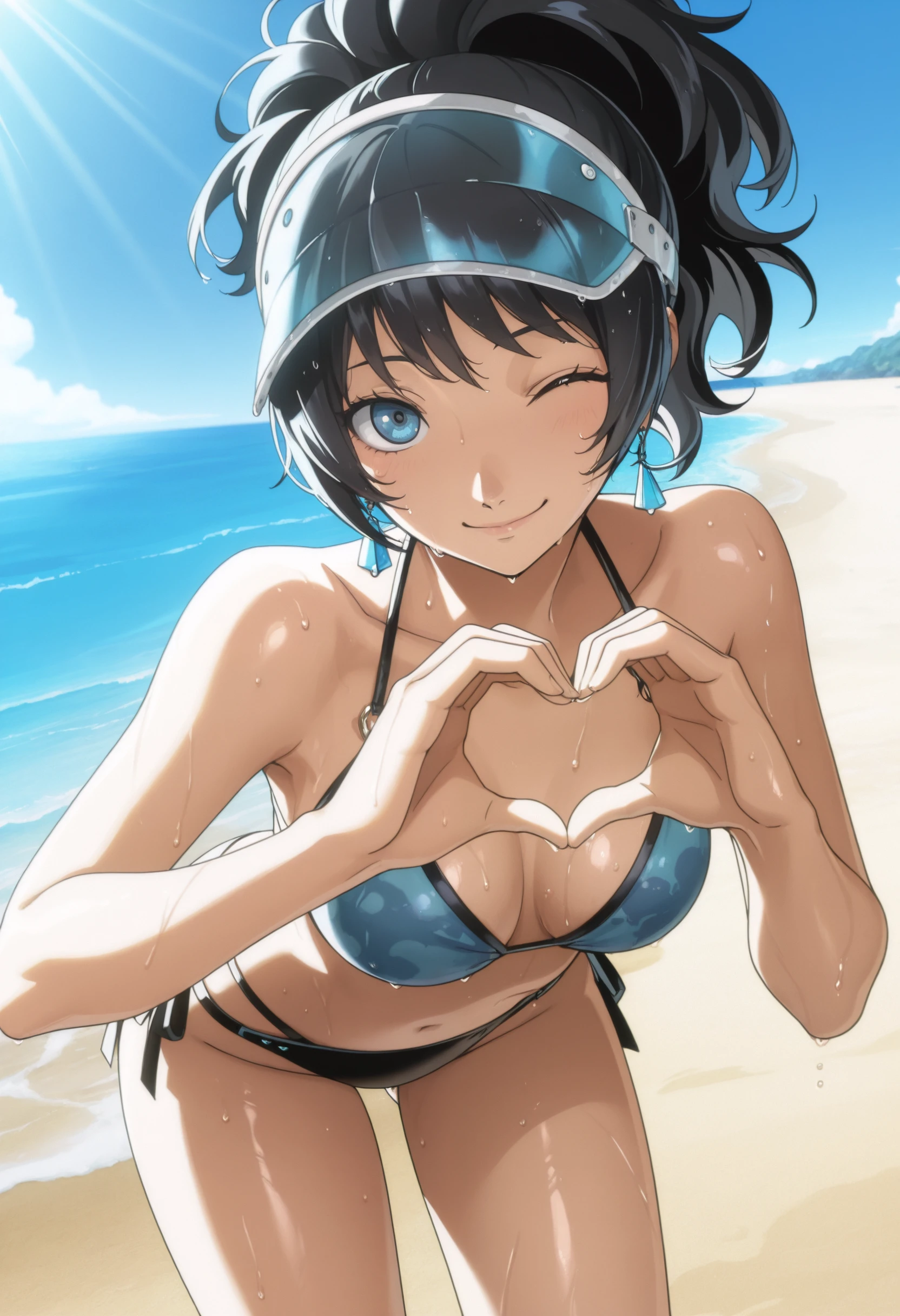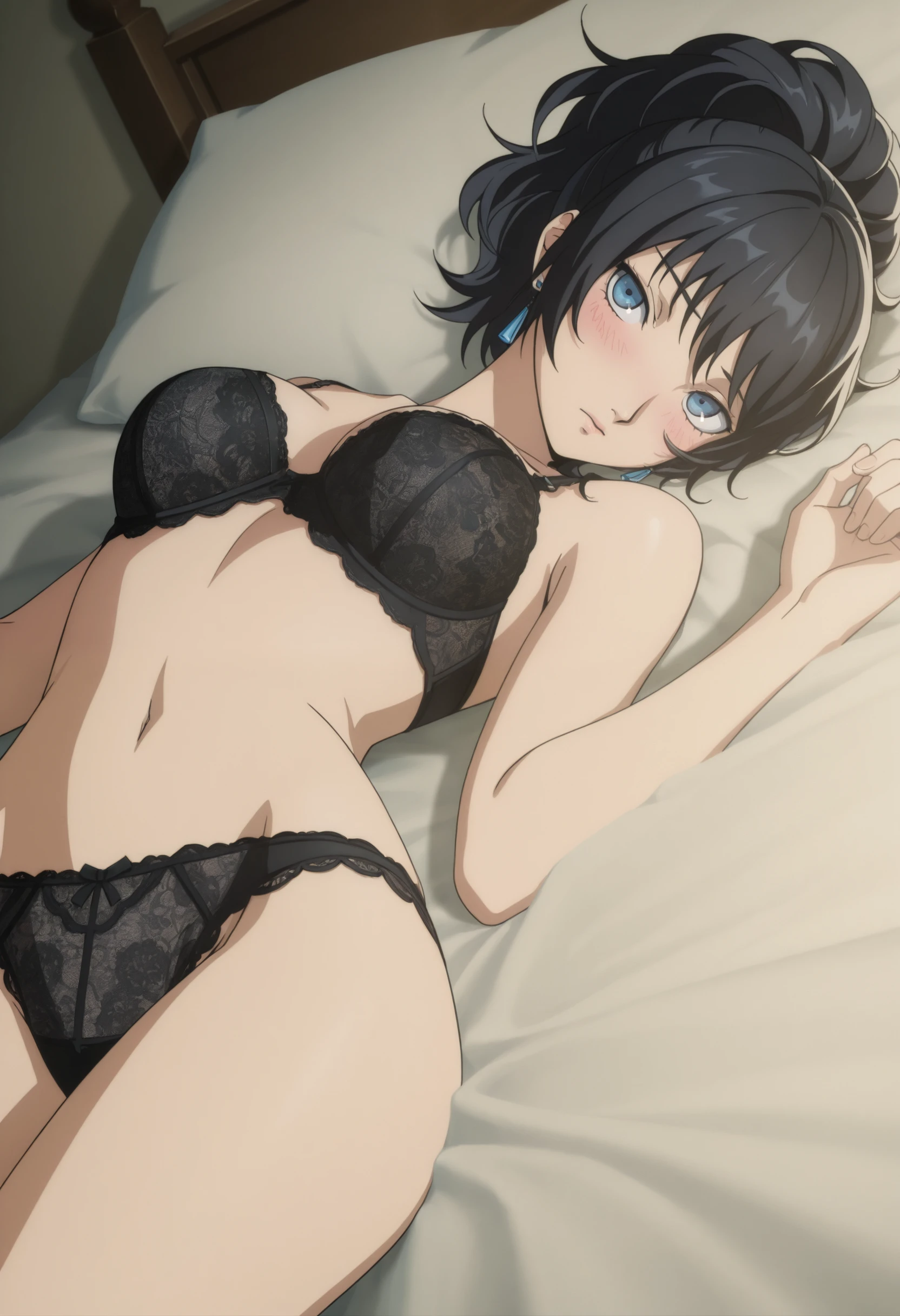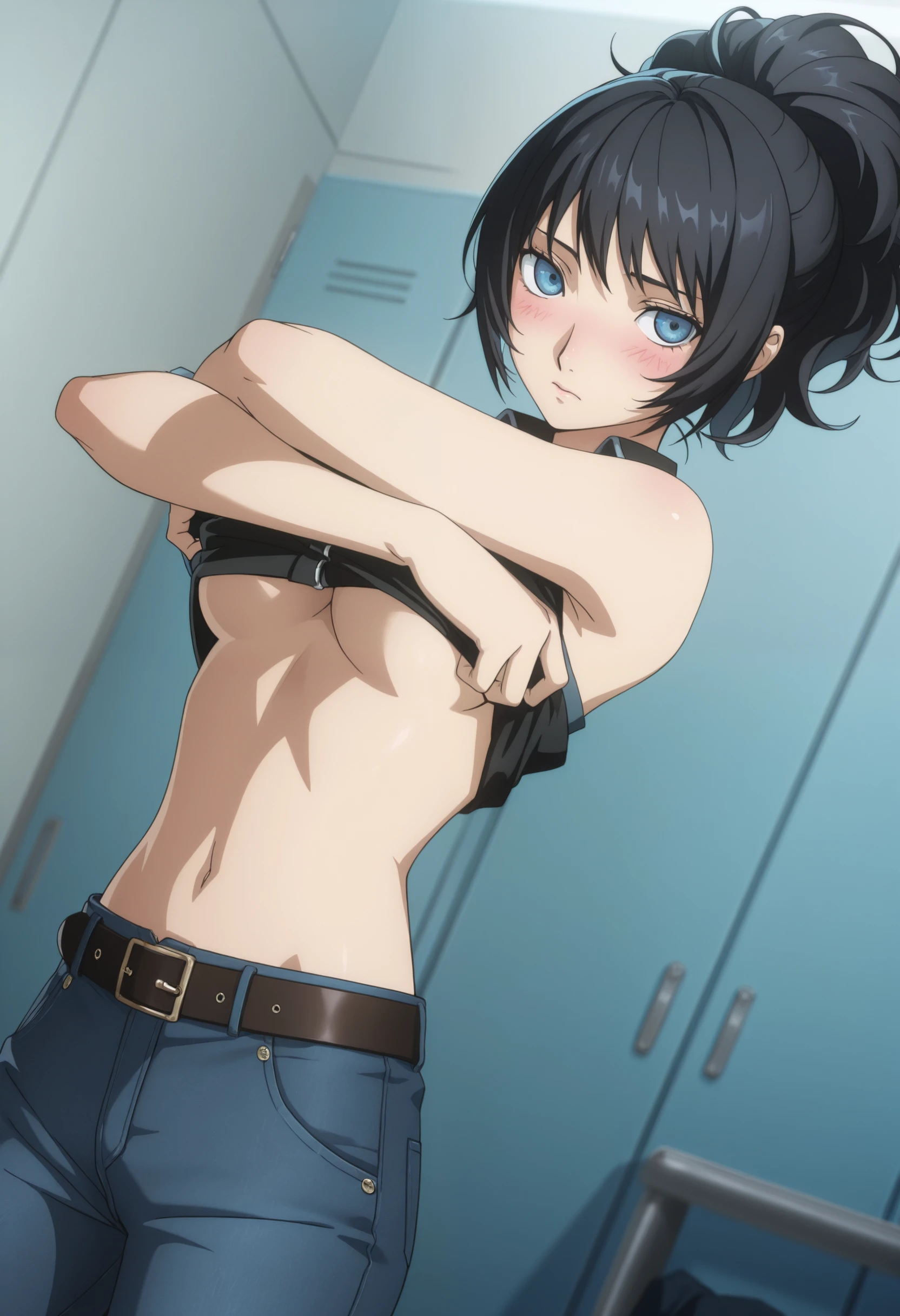 p5xmionatsukawa, blue eyes, black hair, high ponytail, earrings