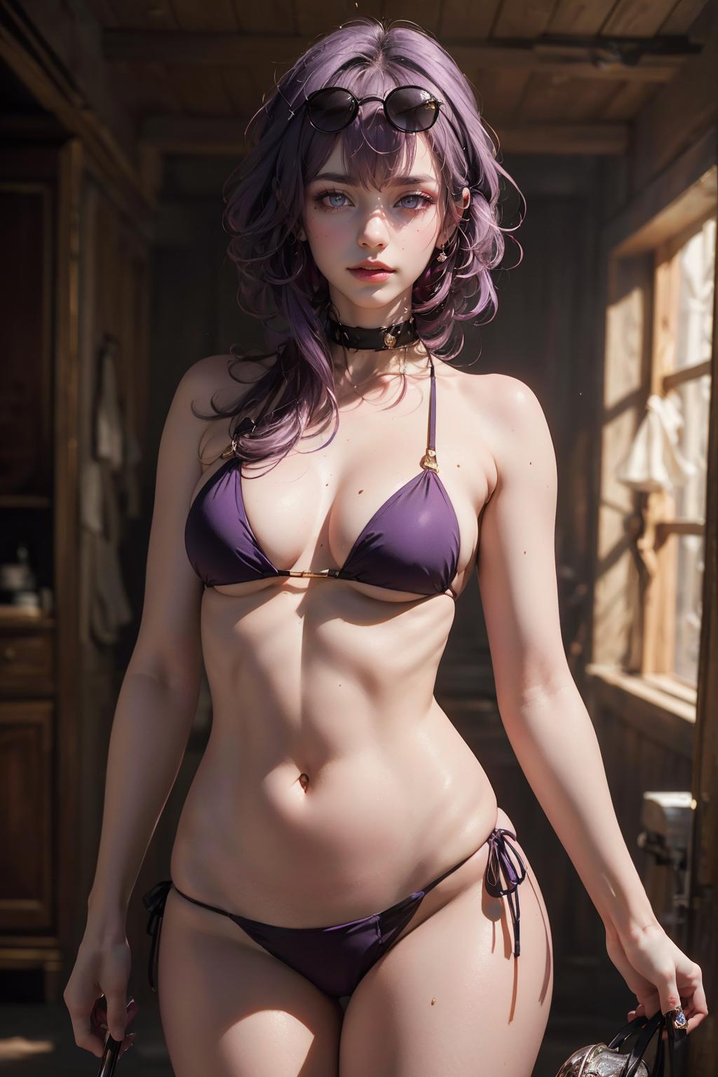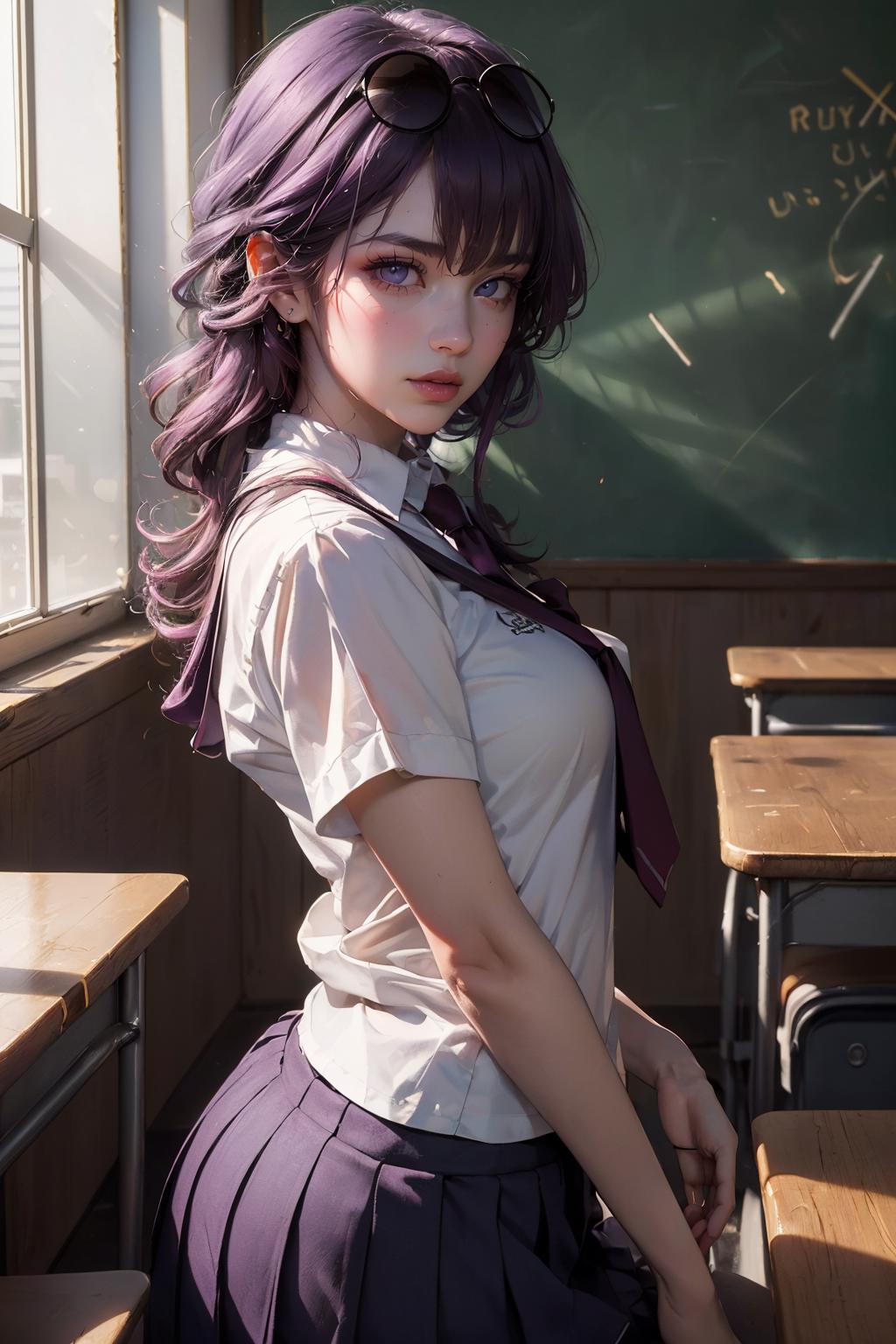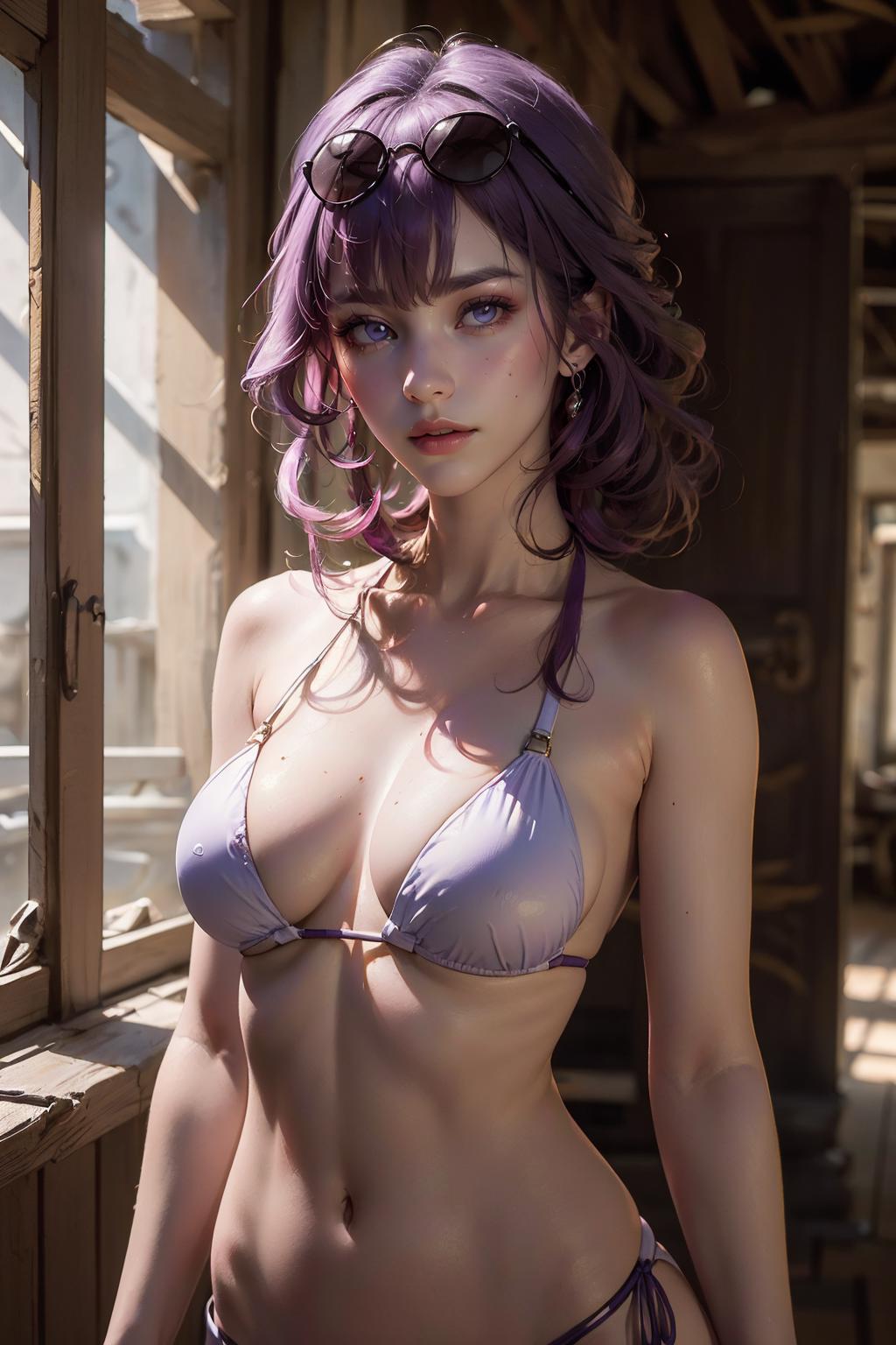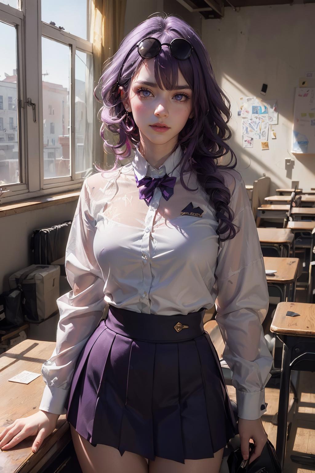 purple eyes, purple hair, eyewear on head, sunglasses,
