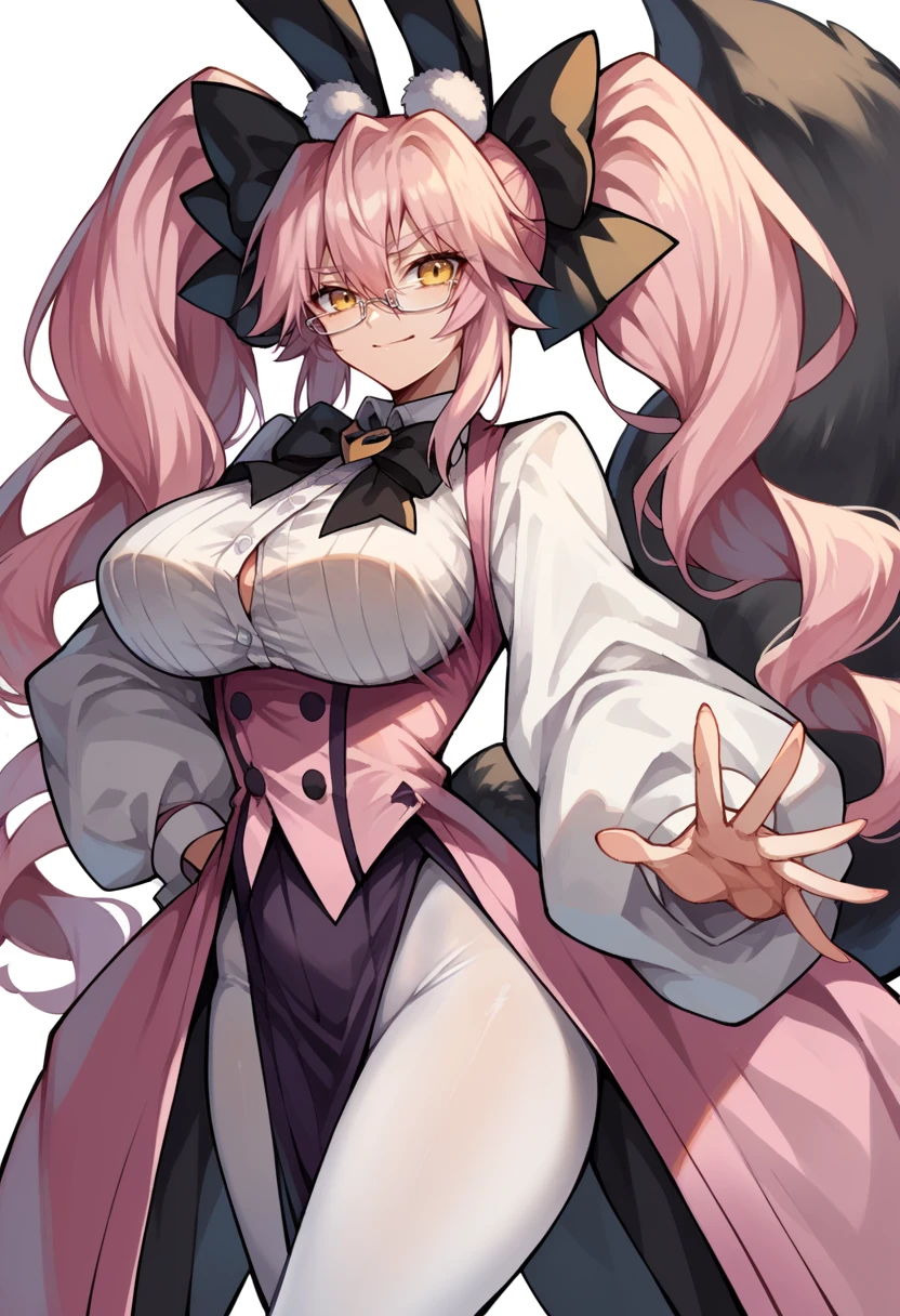 Koyanskaya of Light ASC2: koyanrab, black bow, coattails, collared shirt, fox tail, glasses, hair between eyes, large breasts, long hair, long sleeves, pink hair, pink waistcoat, rabbit ears, sidelocks, sleeveless waistcoat, twintails, underbust, white pantyhose, white shirt, yellow eyes