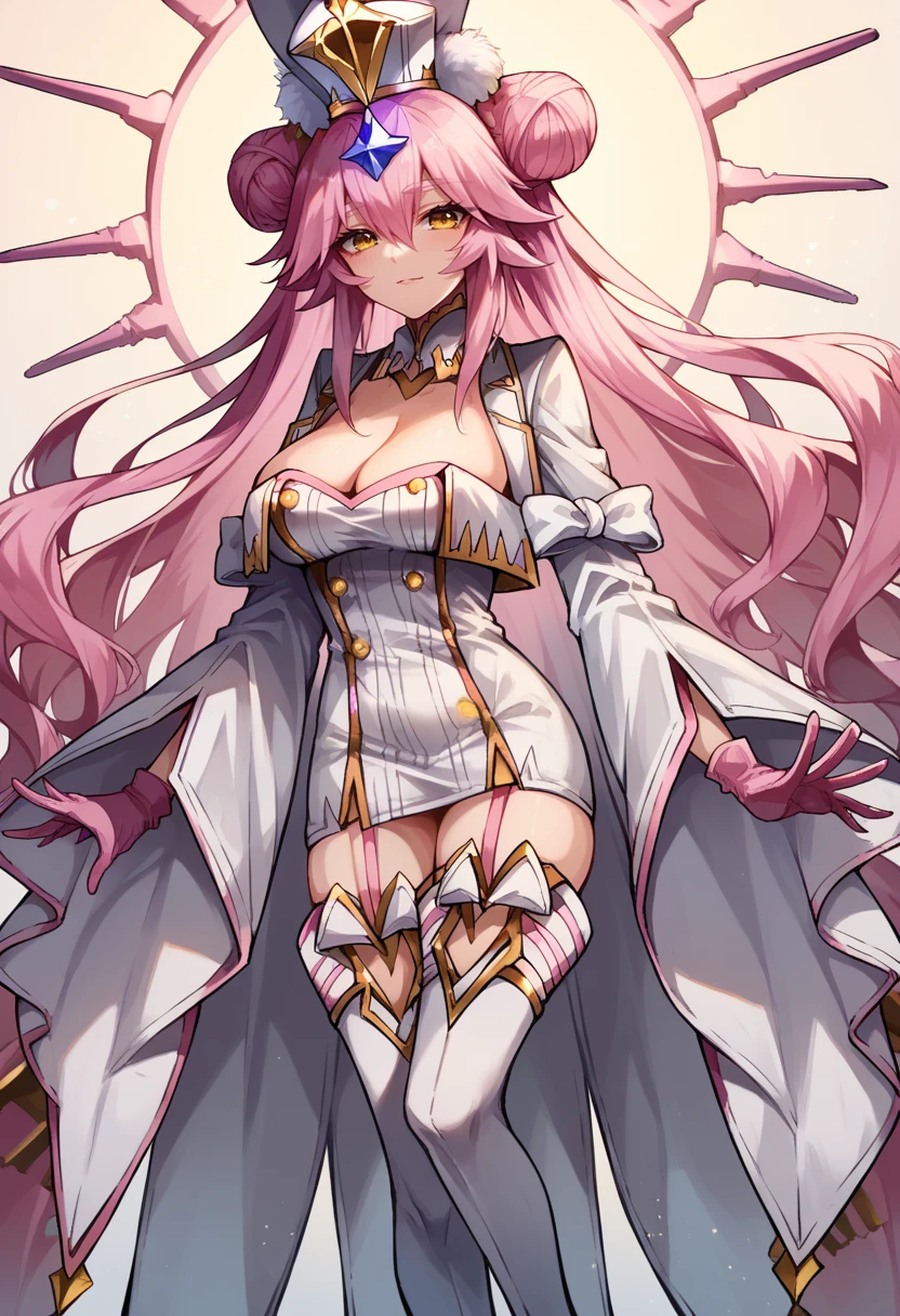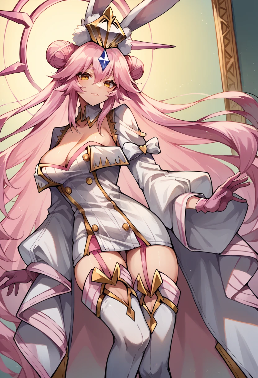 Koyanskaya of Light ASC3: koyangunbun, cleavage, detached collar, double bun, garter straps, gold trim, halo, large breasts, long sleeves, pink garter straps, pink gloves, pink hair, rabbit girl, short dress, sidelocks, very long hair, white headwear, white thigh boots, yellow eyes, - This might require (offshoulder, bare shoulders) in the negs sometimes. Same for ASC2