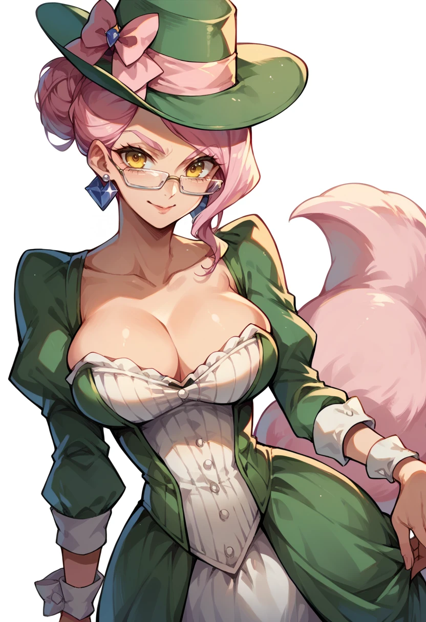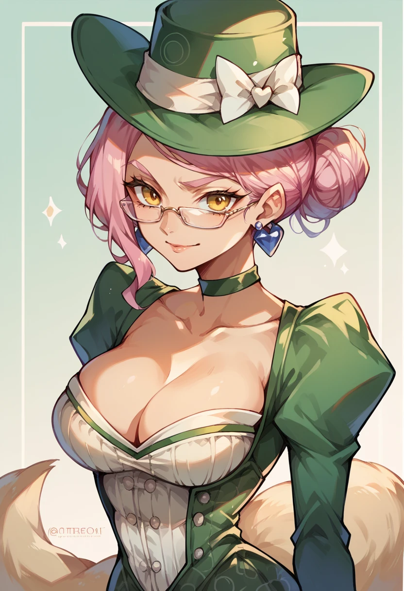 Fae Britain Debutante: koyanbrit, ball gown, bustier, dangle earrings, glasses, green headwear, juliet sleeves, large breasts, cleavage, pink hair, yellow eyes, hair bun, sidelock, fox tail, human ears - may need (fox ears) in the neg