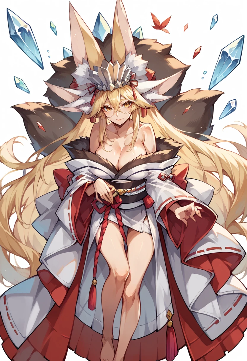 Koyanskaya of Darkness ASC3: koyanbst4, barefoot, blonde hair, crystal crown, extra ears, fox girl, fur-trimmed kimono, hair between eyes, japanese clothes, large breasts, shimenawa, sidelocks, very long hair, white kimono, yellow eyes, collarbone, cleavage, multiple tails,