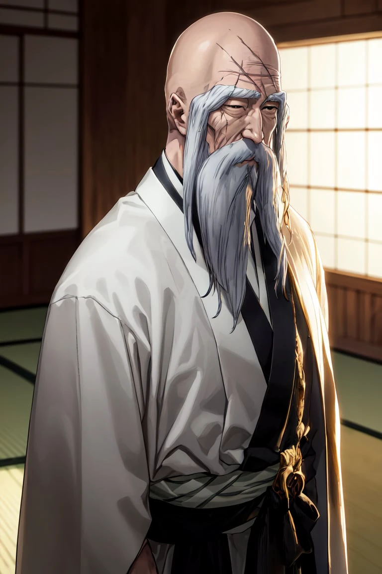 Yamamoto, 1boy, old, very long beard, long eyebrows, mustache, bald, scar, japanese clothes