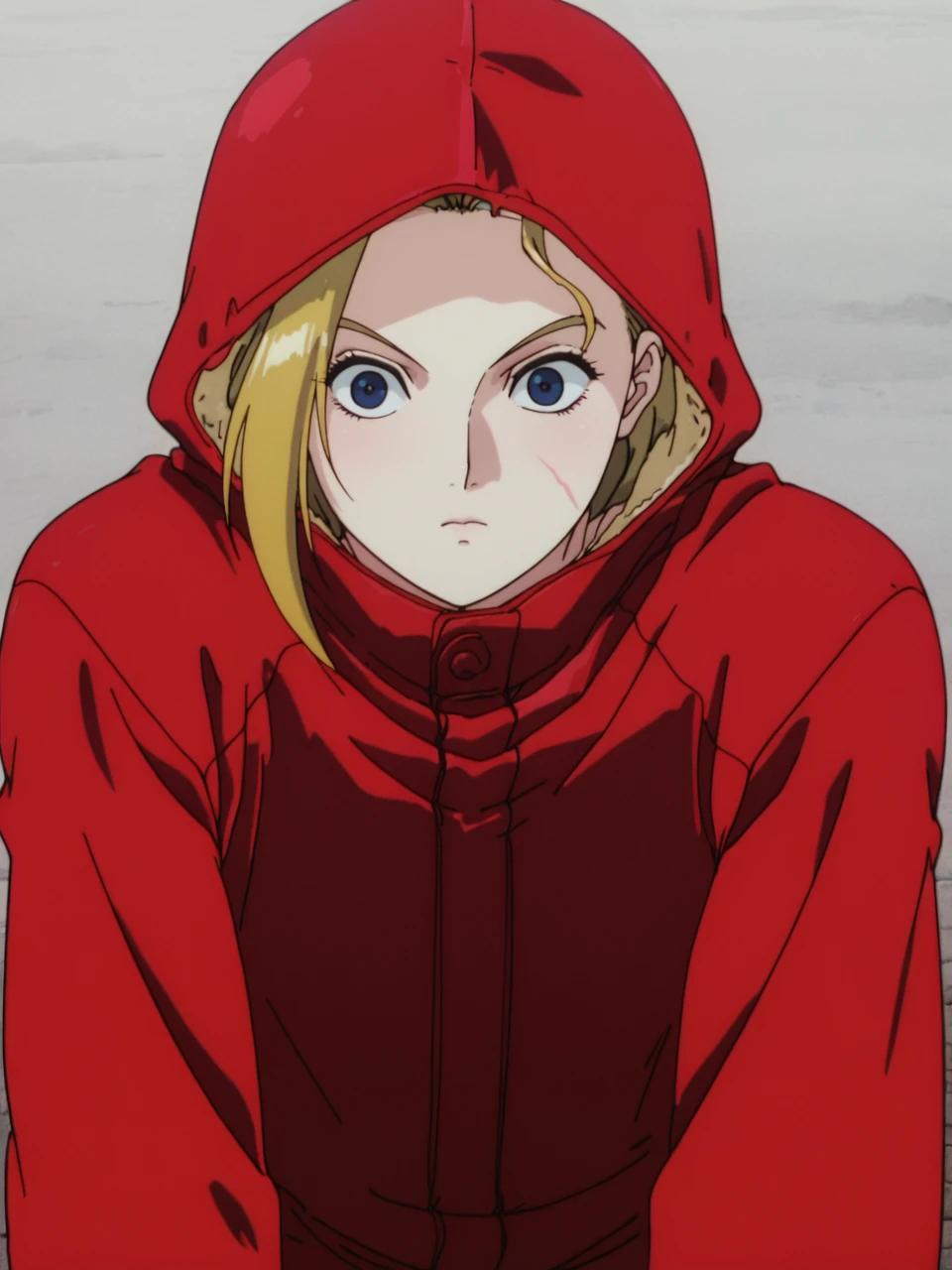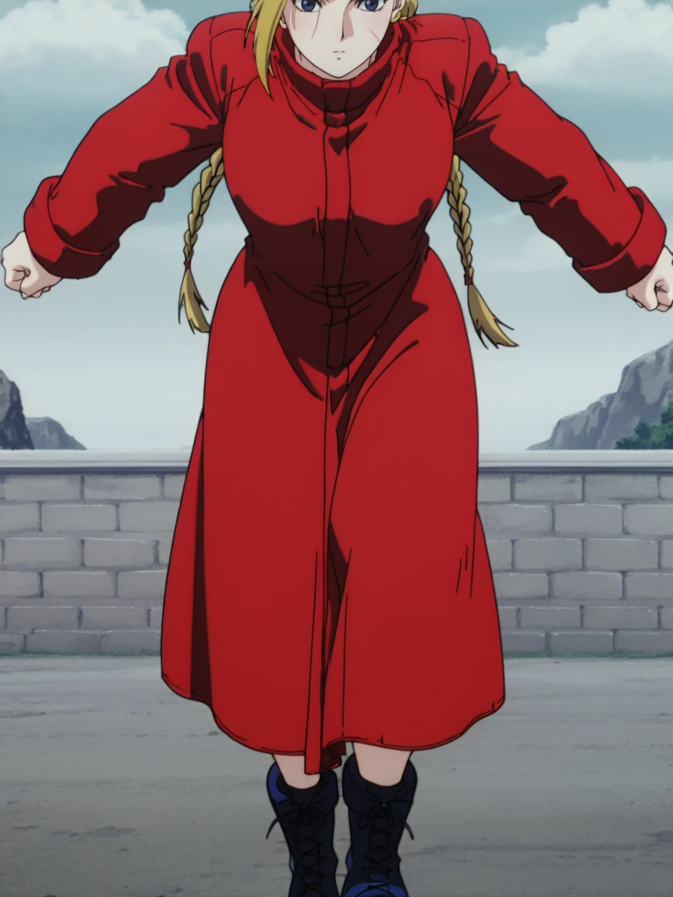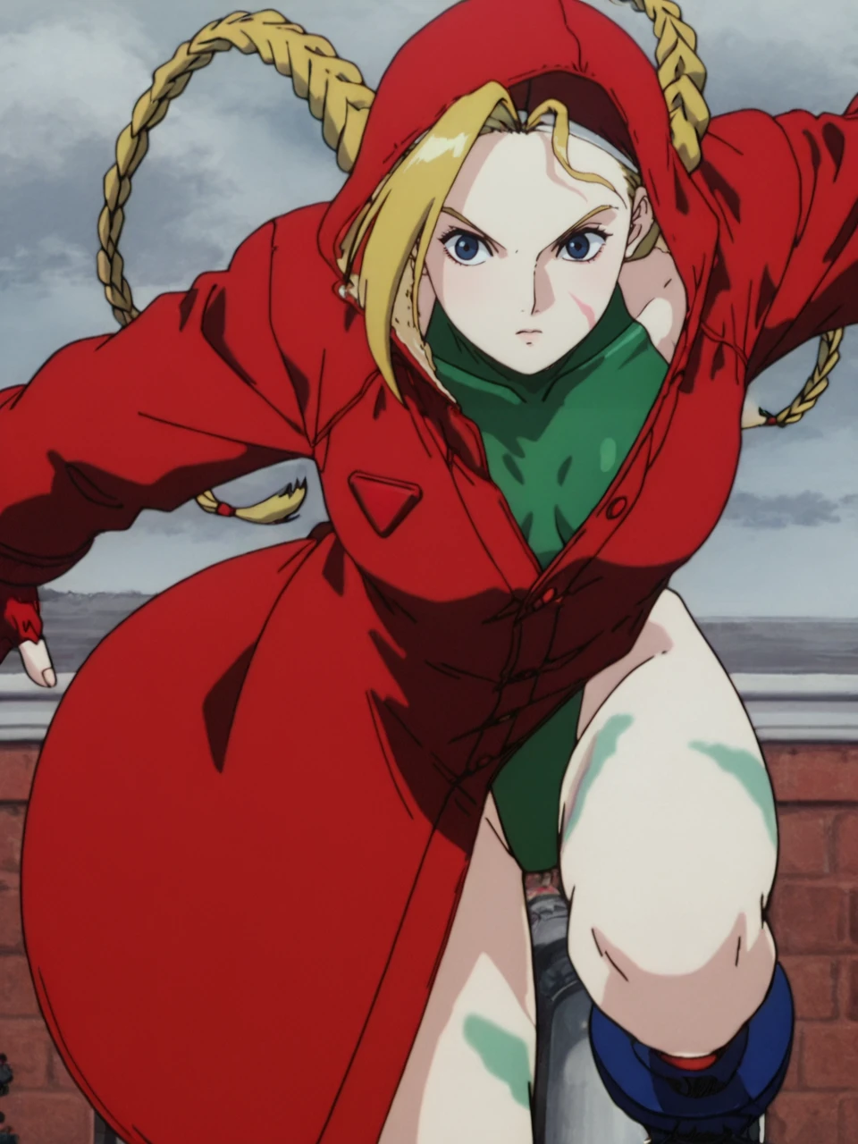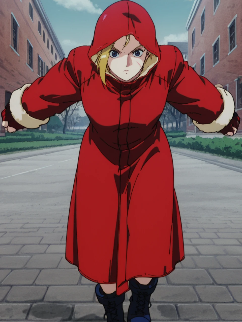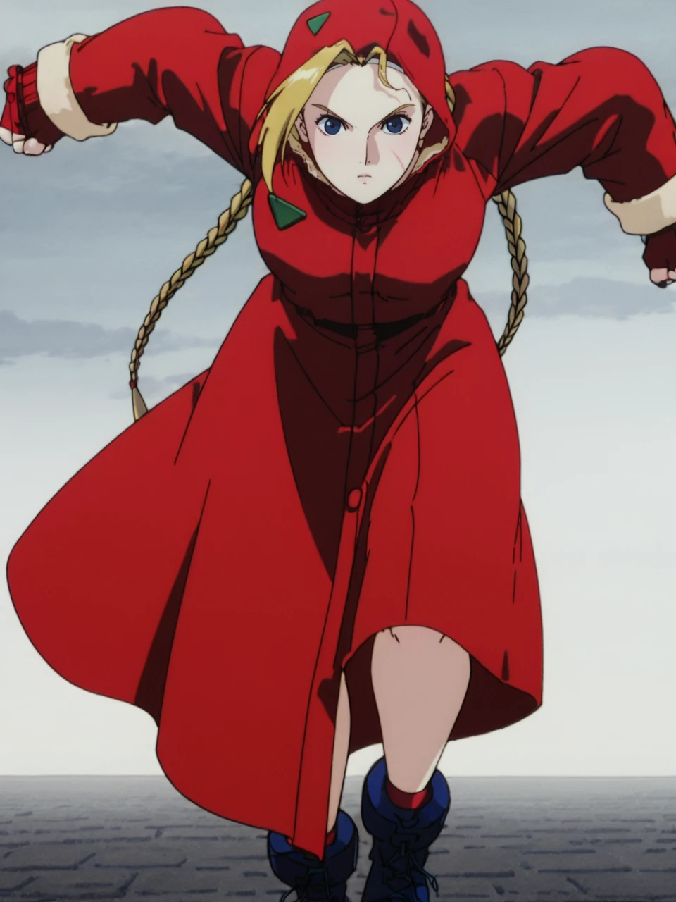 CammySFIIM, 1girl, blonde hair, blue eyes, combat boots, hood, red coat