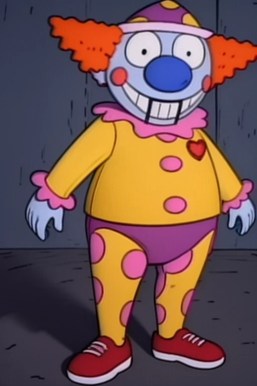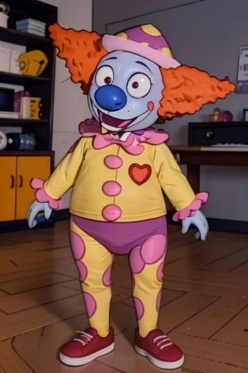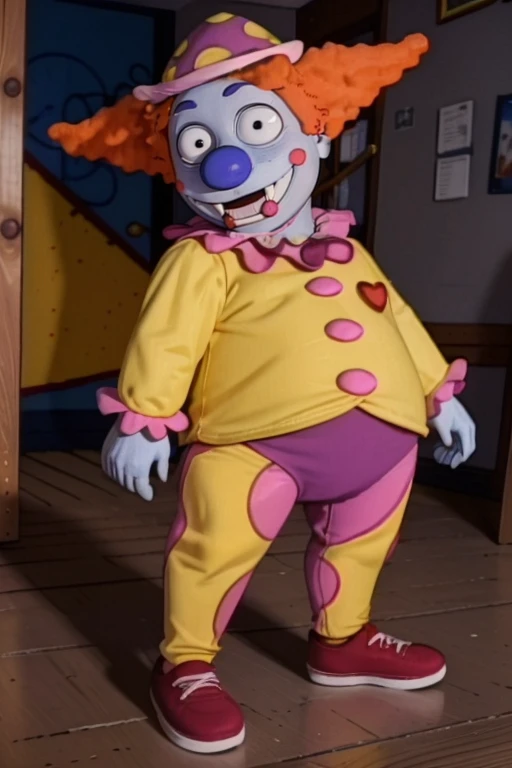 mr_friend, clown_doll, orange hair, grin, blue_skin, yellow_and purple_clown_suit, clown_hat, blue nose, rosey_cheeks, heart_boutonnière, red shoes,