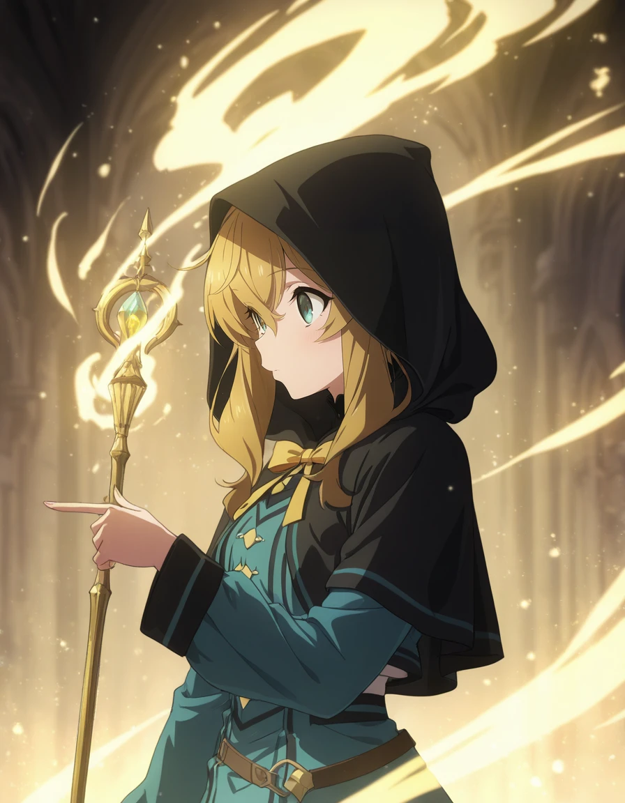 mai_monica_everett,long_hair,blonde_hair,hair_between_eyes,yellow_eyes,black_robe,hood_up,brown_boots,holding_staff
