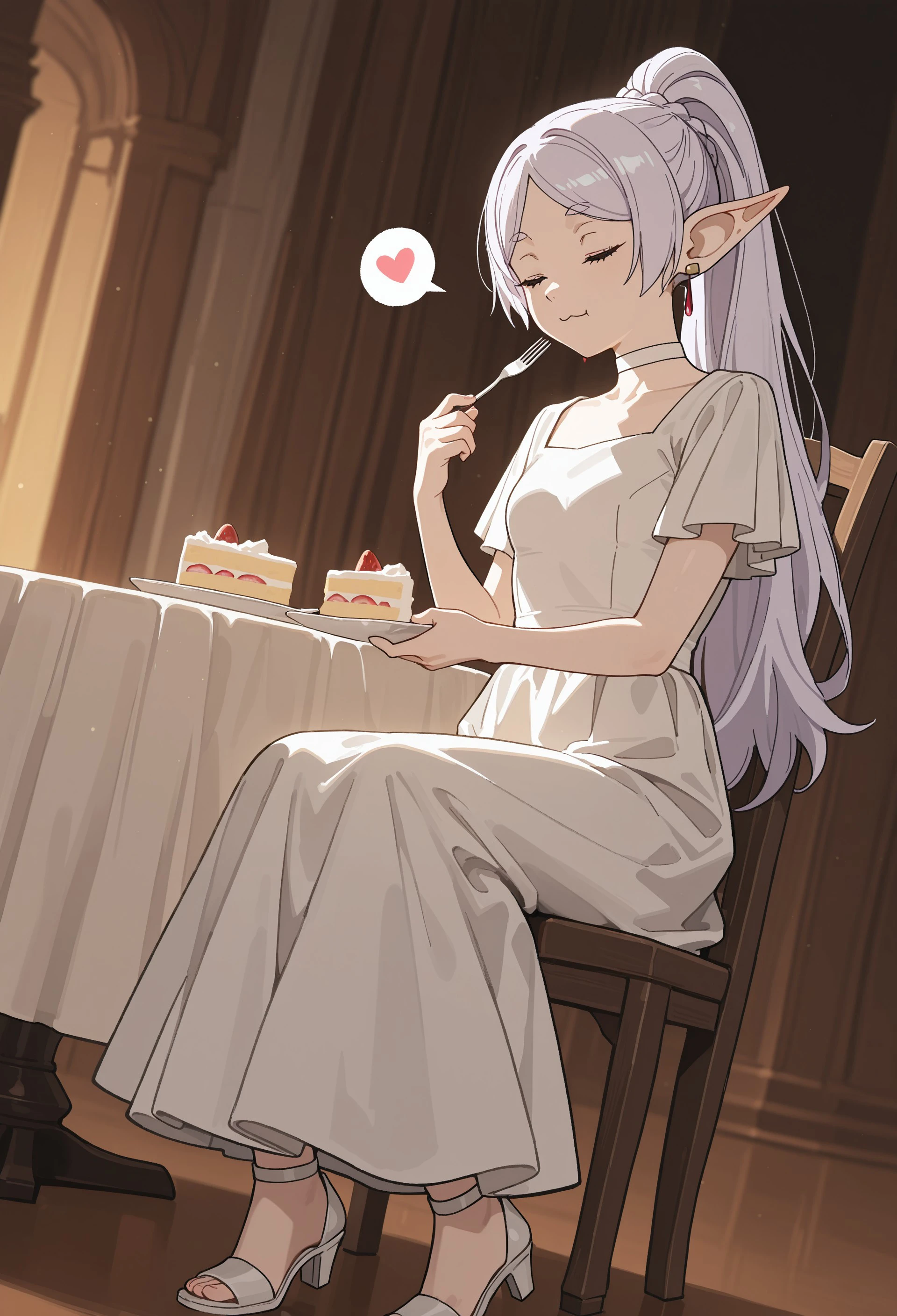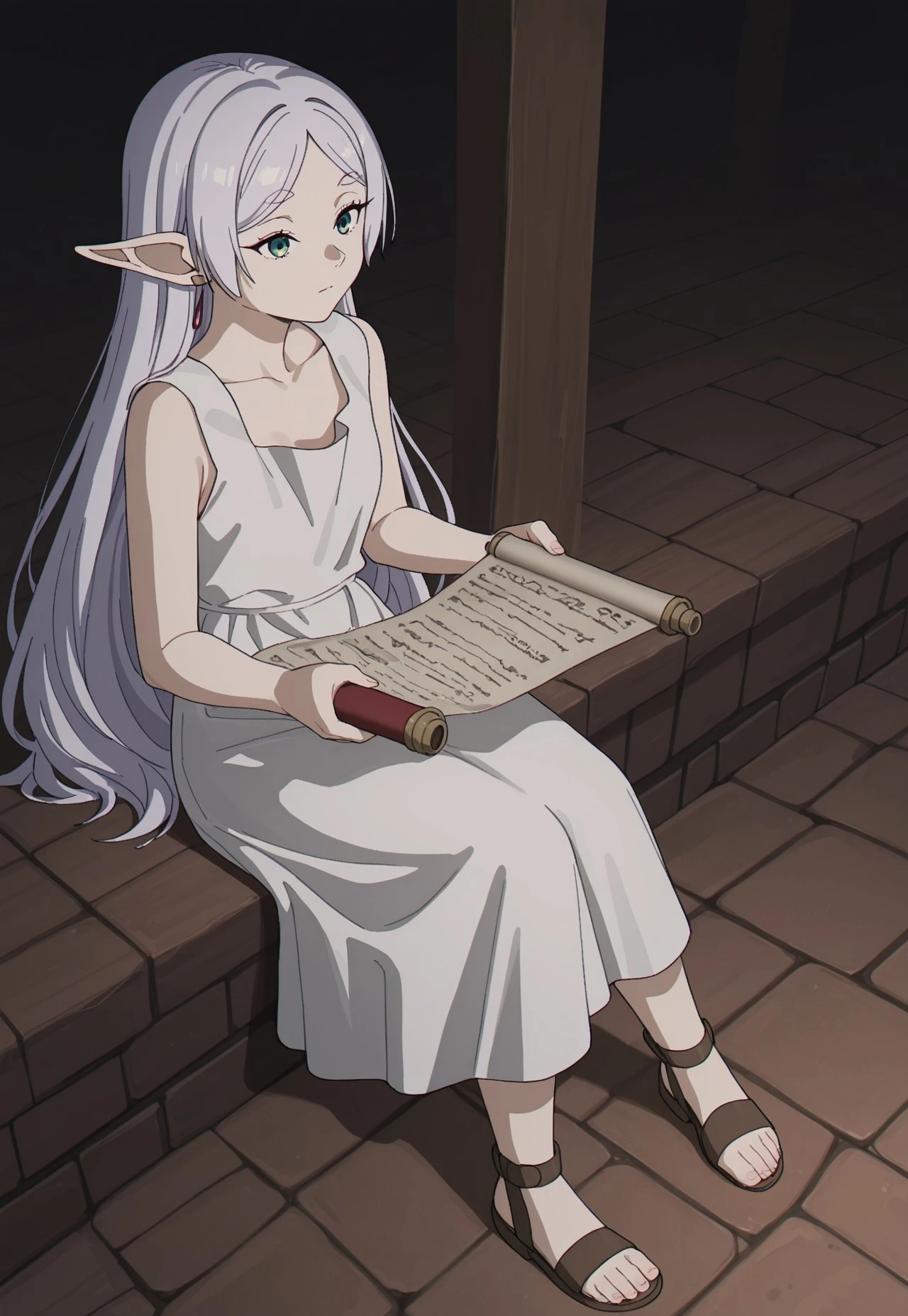WhiteDressFrieren, 1girl, elf, pointy ears, official alternate hairstyle, white hair, parted bangs, long hair, hair down, green eyes, small breasts, official alternate costume, white sundress, medium dress, sleeveless, loose clothes, brown sandals,