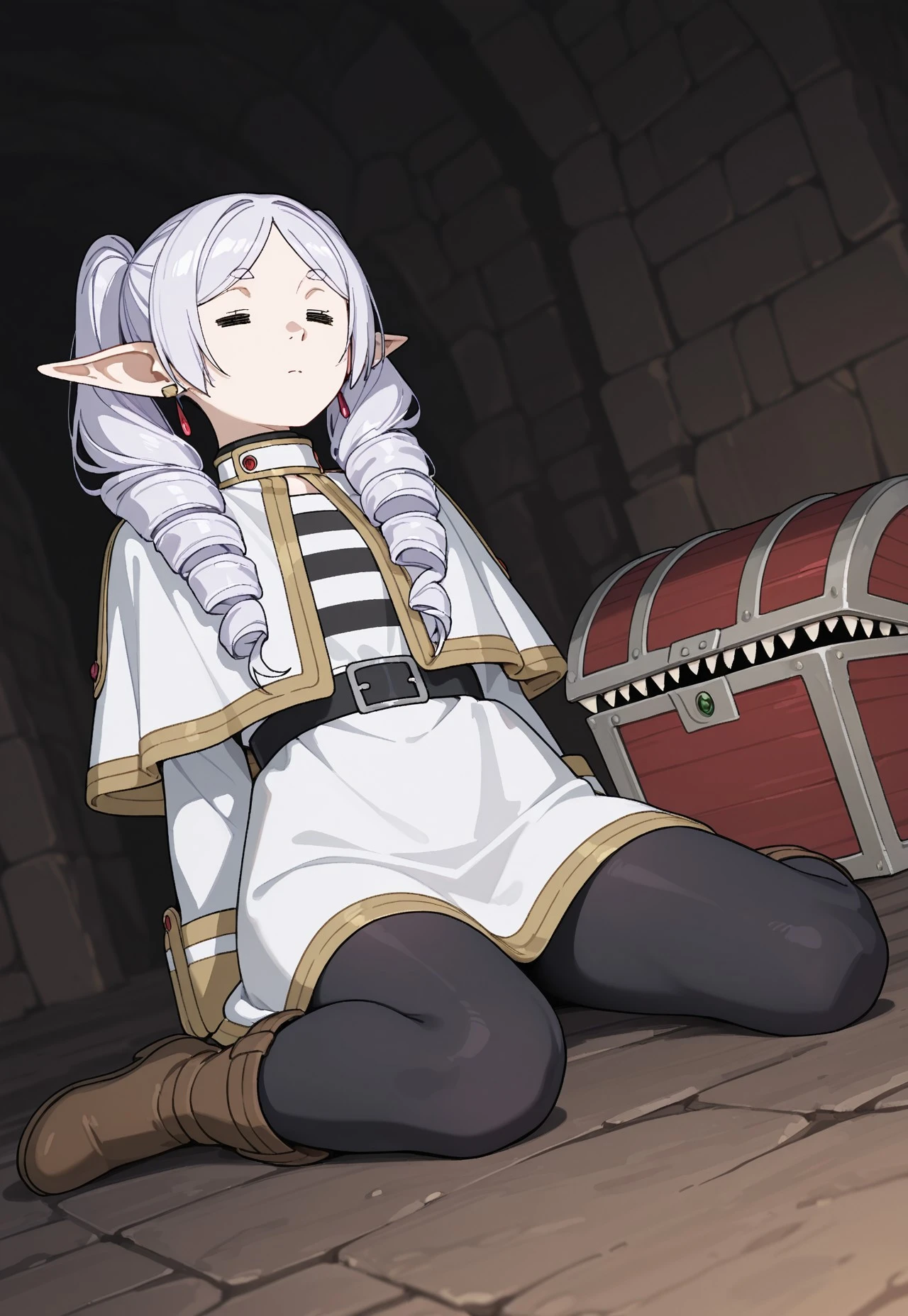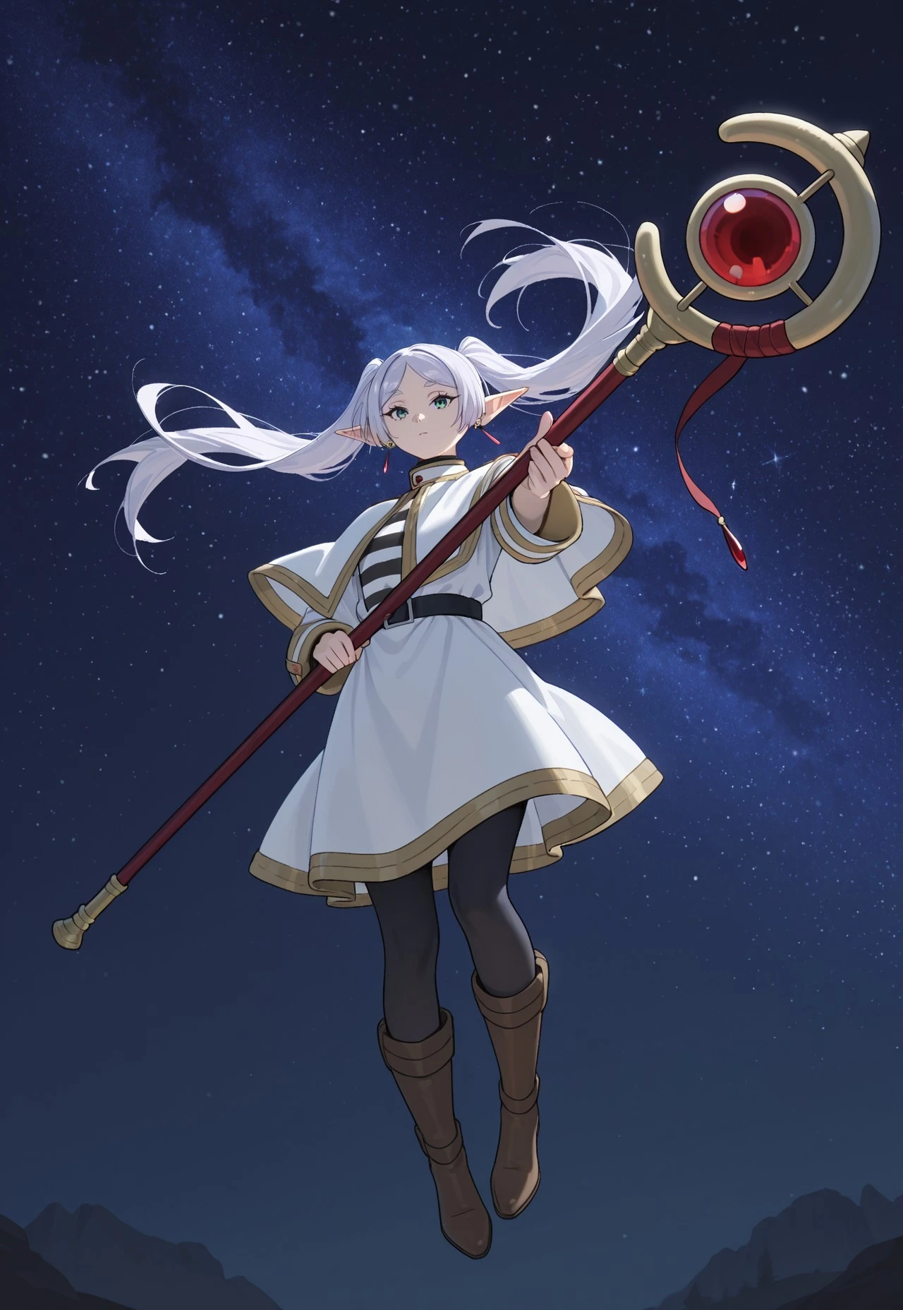 SSNFrieren, 1girl, elf, pointy ears, white hair, parted bangs, long hair, twintails, hair over shoulder, green eyes, small breasts, floating earring, earrings, layered clothes, gold trim, white capelet, striped shirt, white open jacket, long sleeves, shirt tucked in, jacket tucked in, black belt, white skirt, black pantyhose, brown boots,