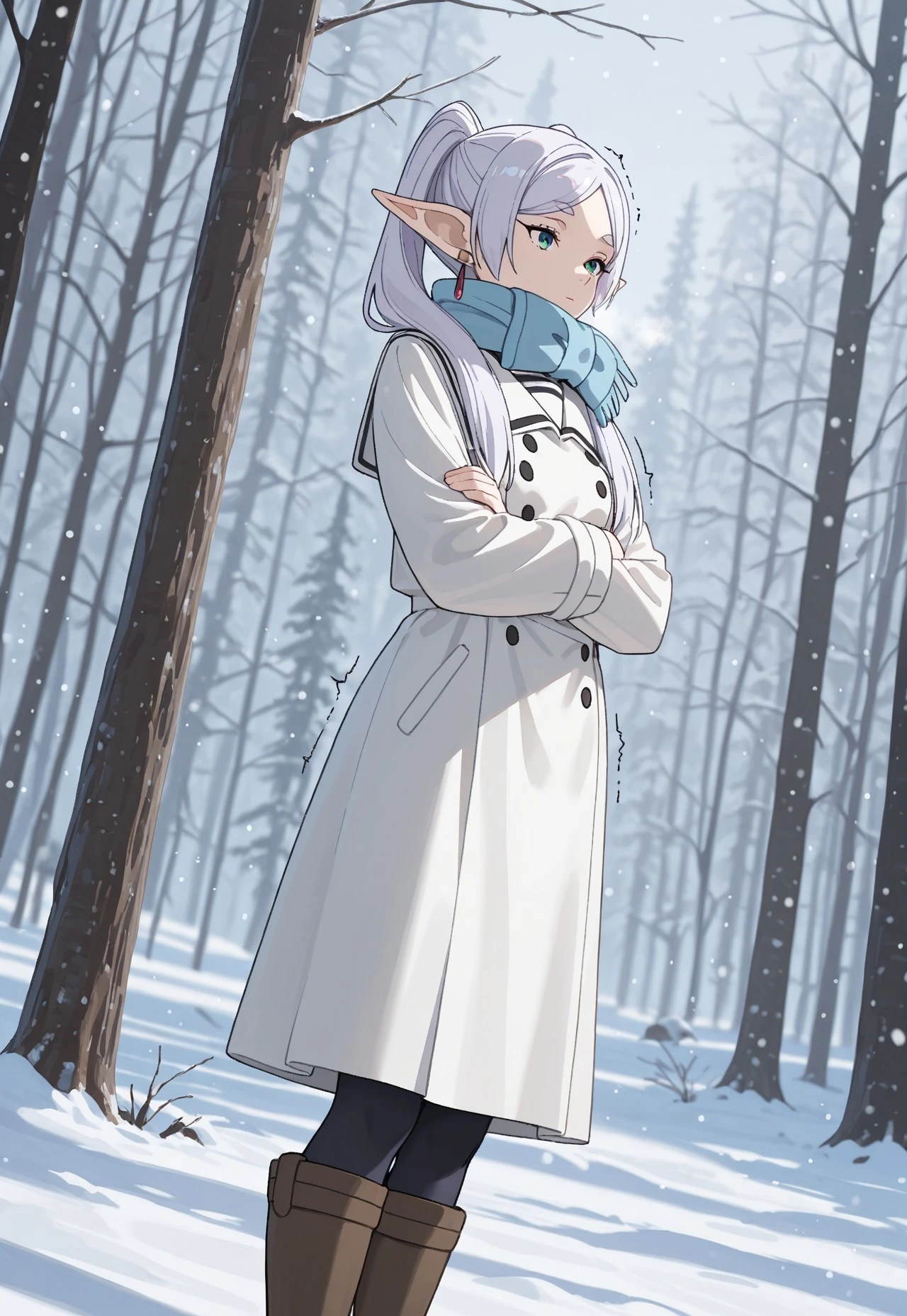 WinterFrieren, 1girl, elf, pointy ears, white hair, parted bangs, long hair, twintails, hair over shoulder, green eyes, small breasts, earrings, official alternate costume, blue scarf, sailor collar, double-breasted, white long coat, black pantyhose, brown boots,