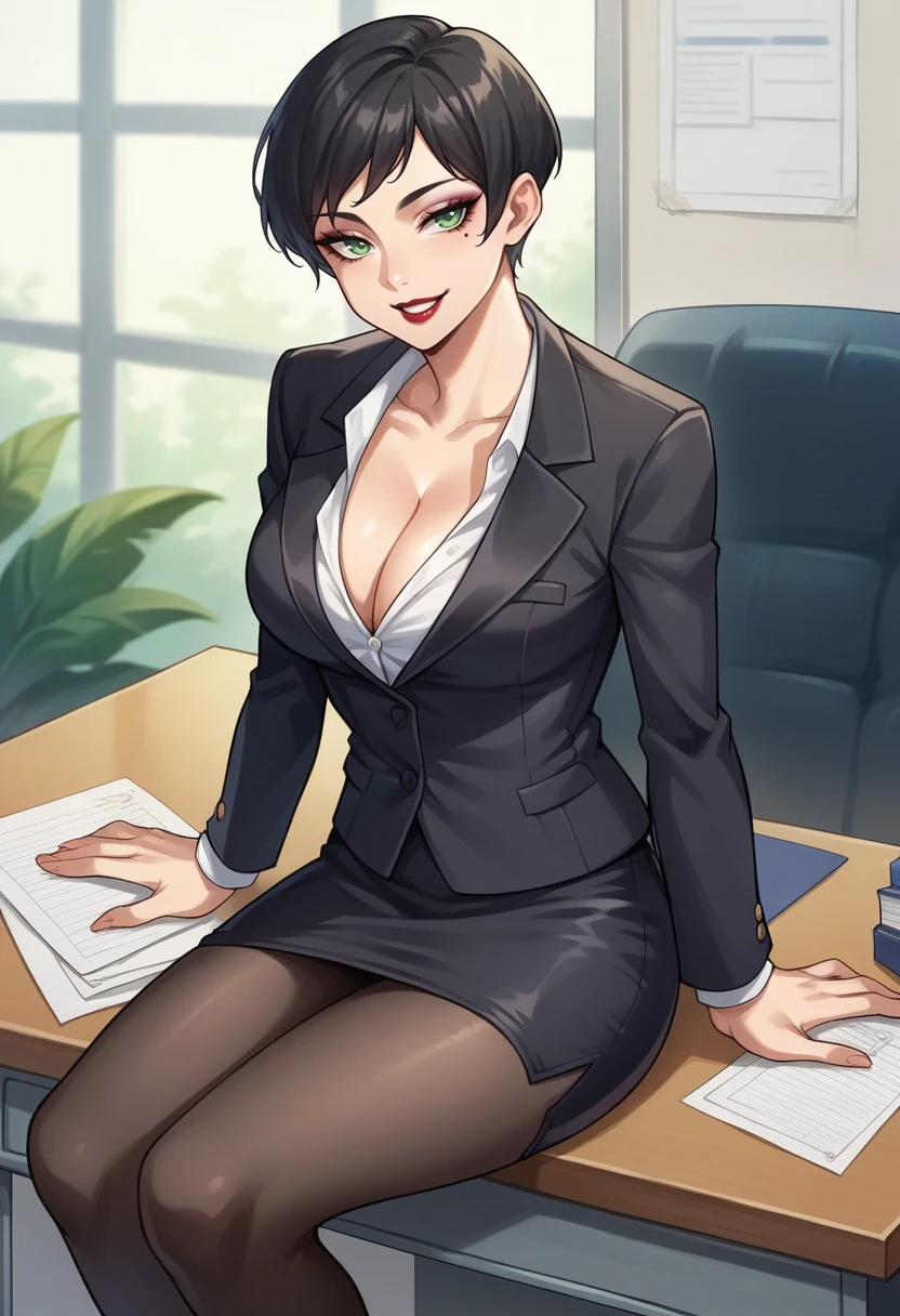 yurikosmtiv, black hair, short hair, lipstick, mole under eye, makeup, green eyes, black bodysuit