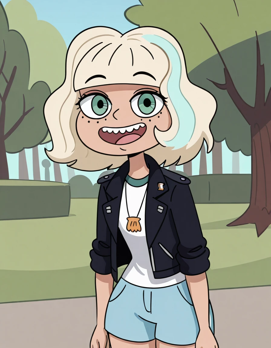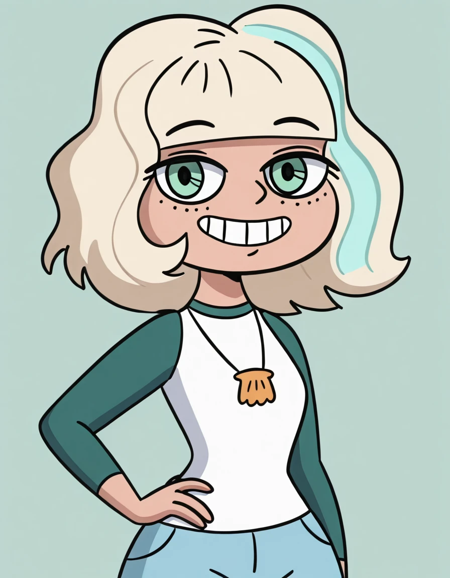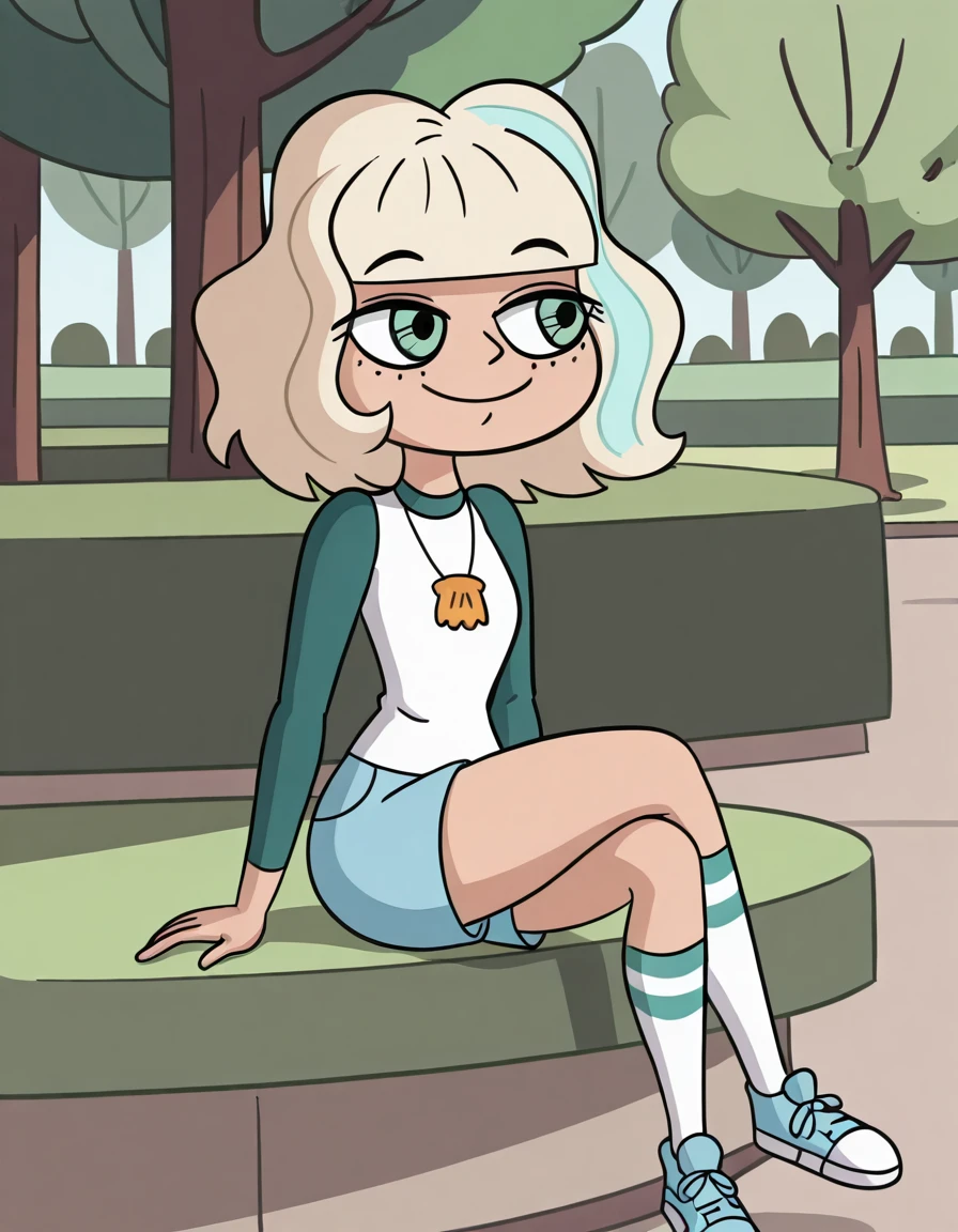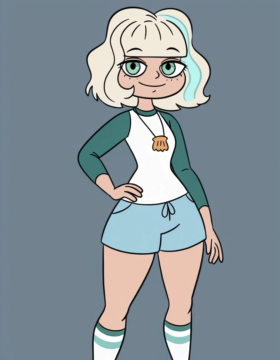 jackiel, blonde hair, 1girl, green eyes, solo, multicolored hair, short hair, shirt, shell necklace, bangs, long sleeves, blue shorts, socks,sneakers,