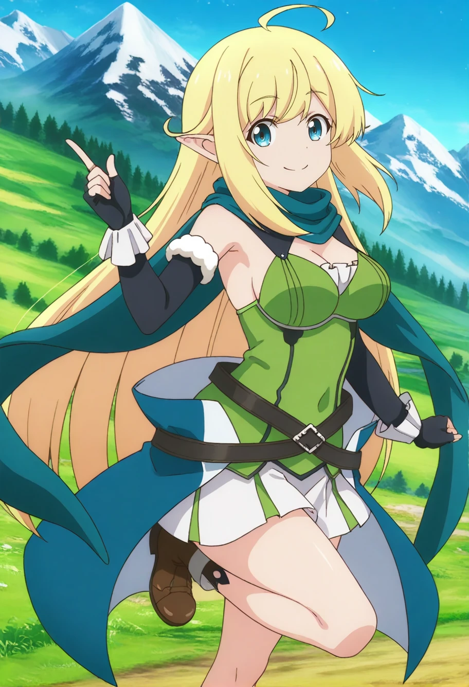 halkara-default,blue eyes,blonde hair,long hair, ahoge,elf,pointy ears,green shirt,cleavage,sleeveless,white skirt,scarf,waist cape,belt,detached sleeves,elbow gloves,brown footwear
