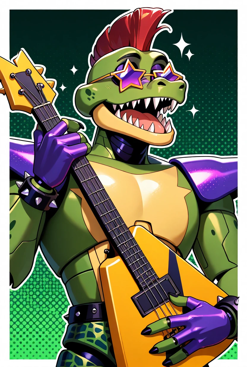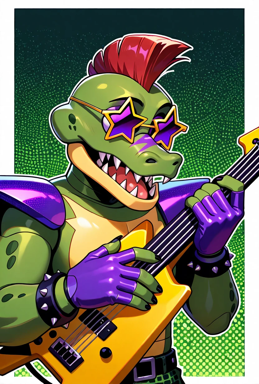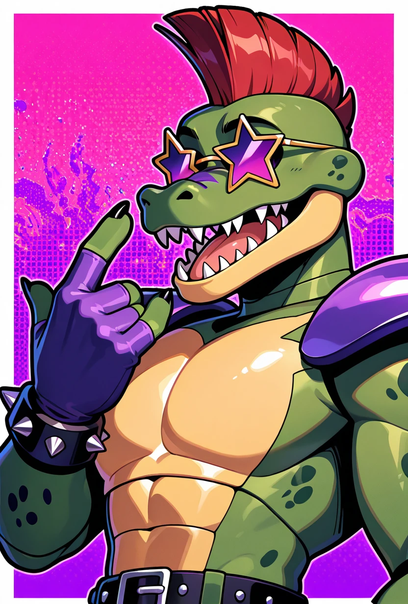 monty, 1boy, sharp teeth, green skin, sunglasses, spikes, crocodilian, red hair, red mohawk, star-shaped eyewear, , spiked bracelet, belt, purple shoulder pads, purple fingerless gloves,