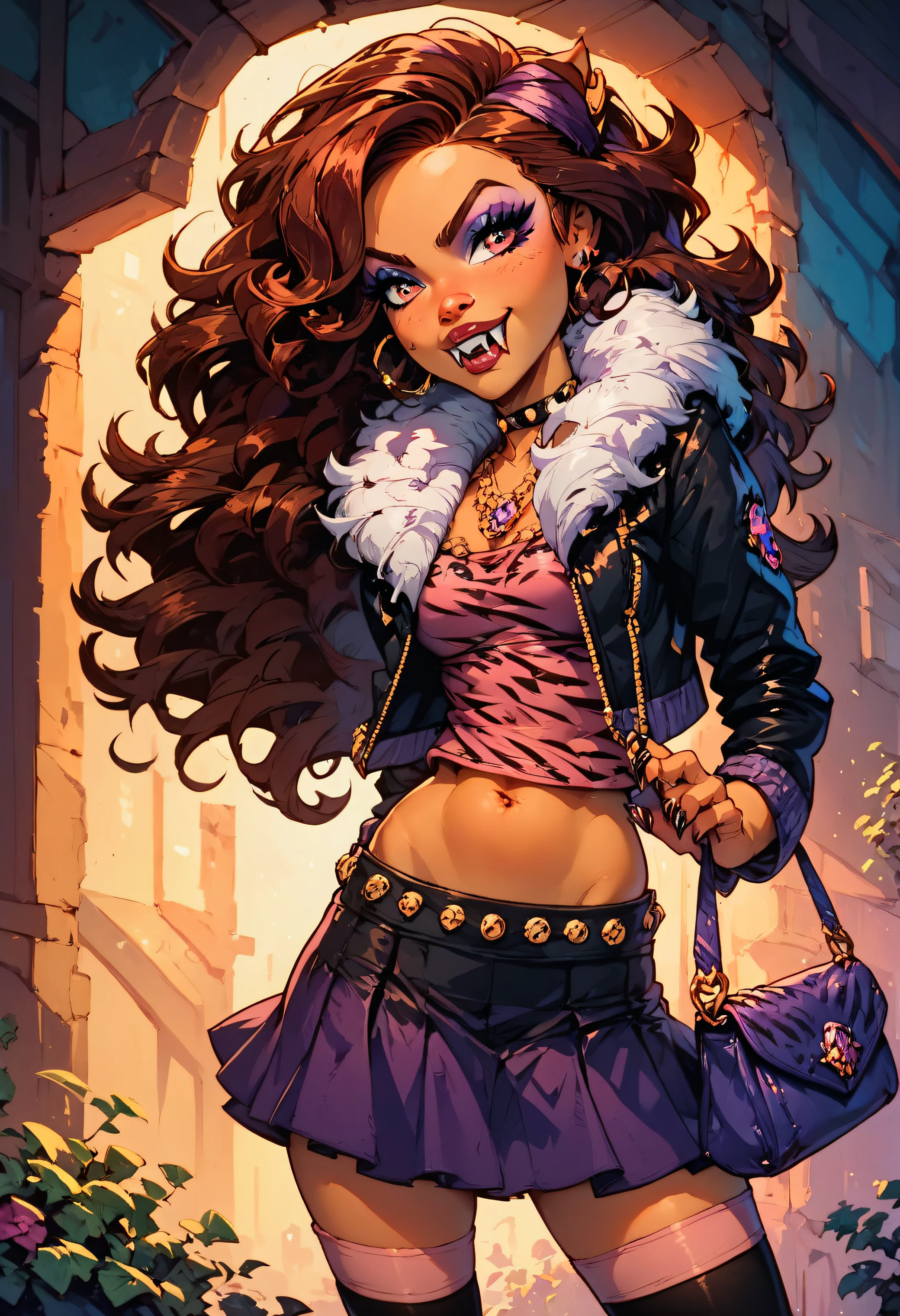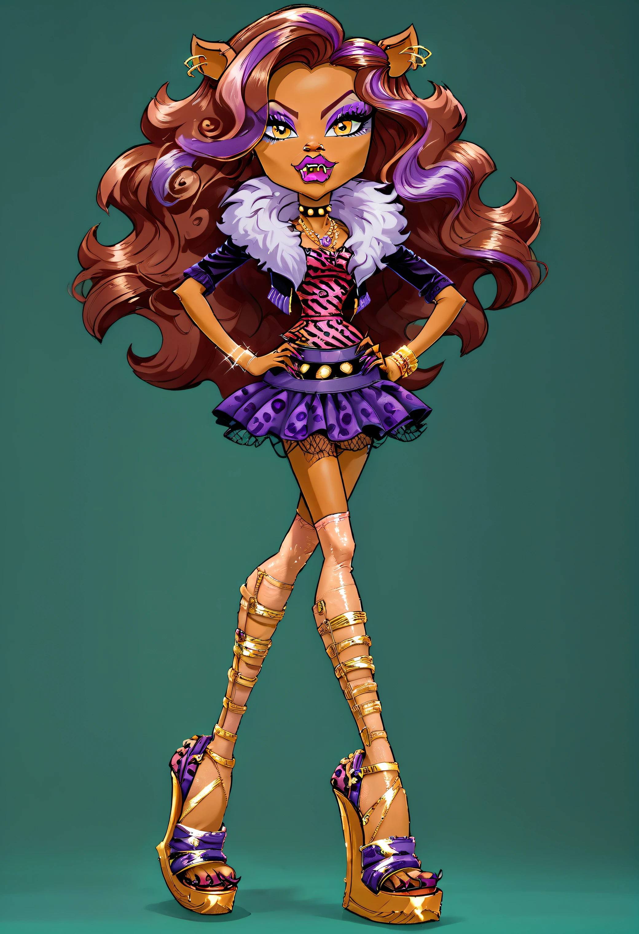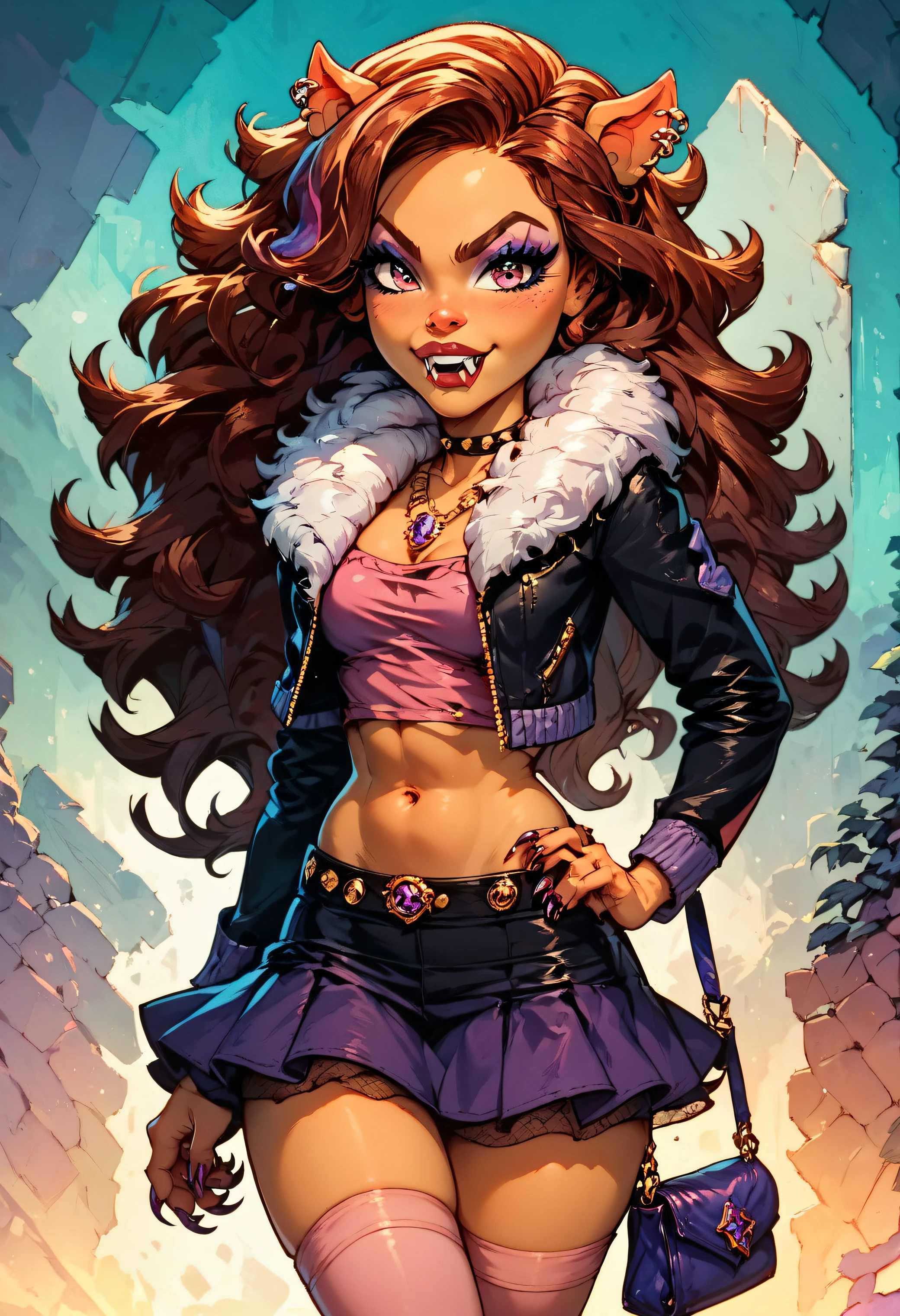 clawdeen, fur-trimmed jacket, jewelry, ear piercing, purple miniskirt, animal print shirt, makeup, thighhighs, eyeshadow, fangs, claws, fishnets