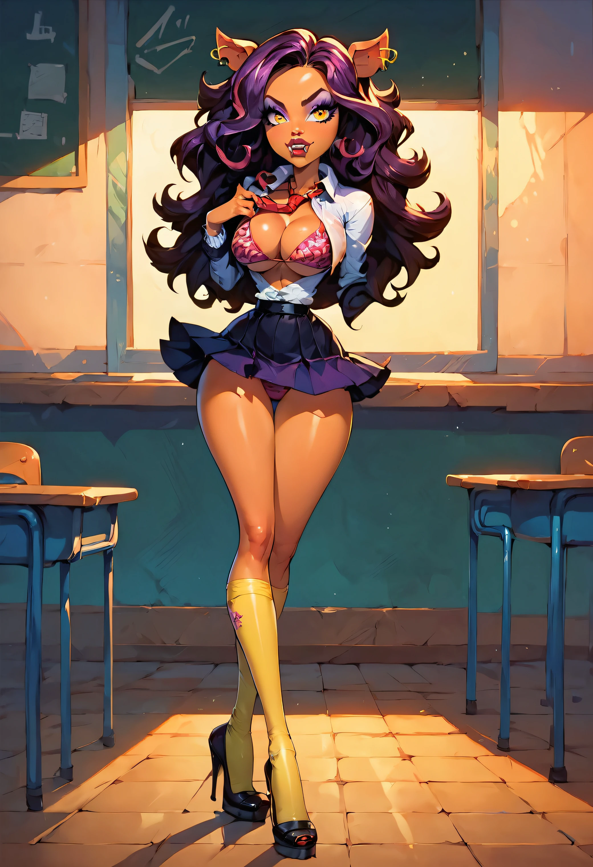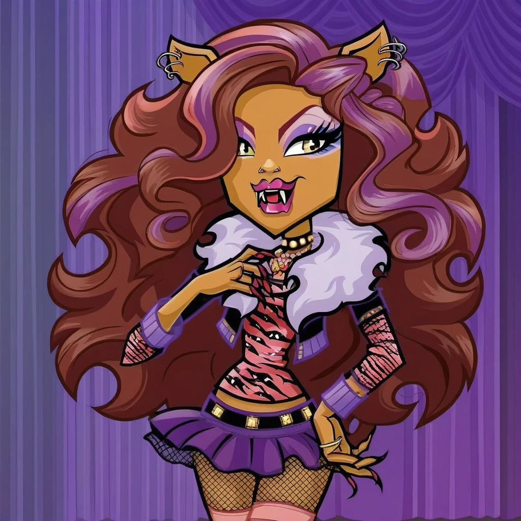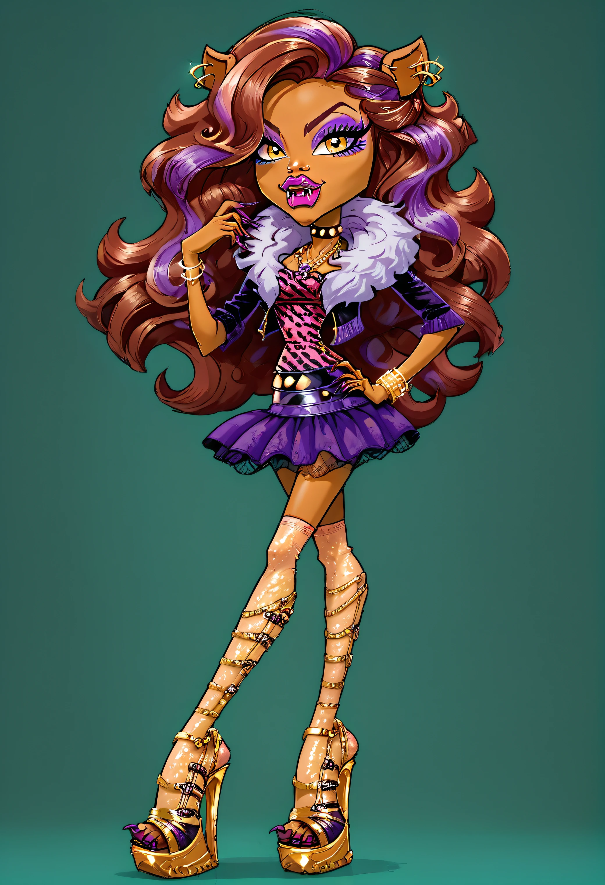 clawdeen, fur-trimmed jacket, jewelry, ear piercing, purple miniskirt, animal print shirt, makeup, thighhighs, eyeshadow, fangs, claws, fishnets